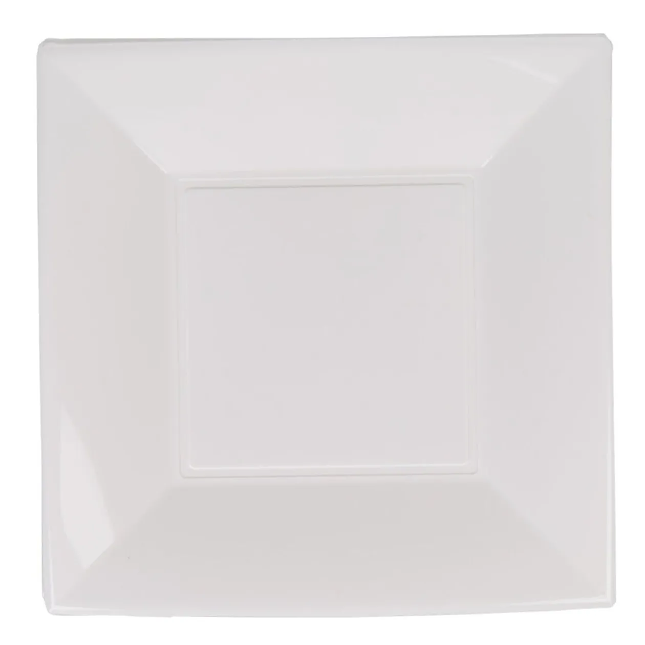Lot de 6 assiettes jetables carrées à bord incurvé en plastique de couleur blanc nacré.
