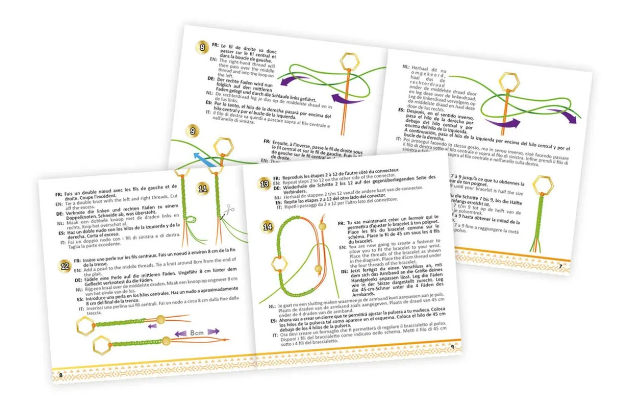 Crée ton propre bracelet en utilisant la technique du macramé : choisis un connecteur en métal et aide-toi de la notice illustrée pour tisser le bracelet de ton choix.