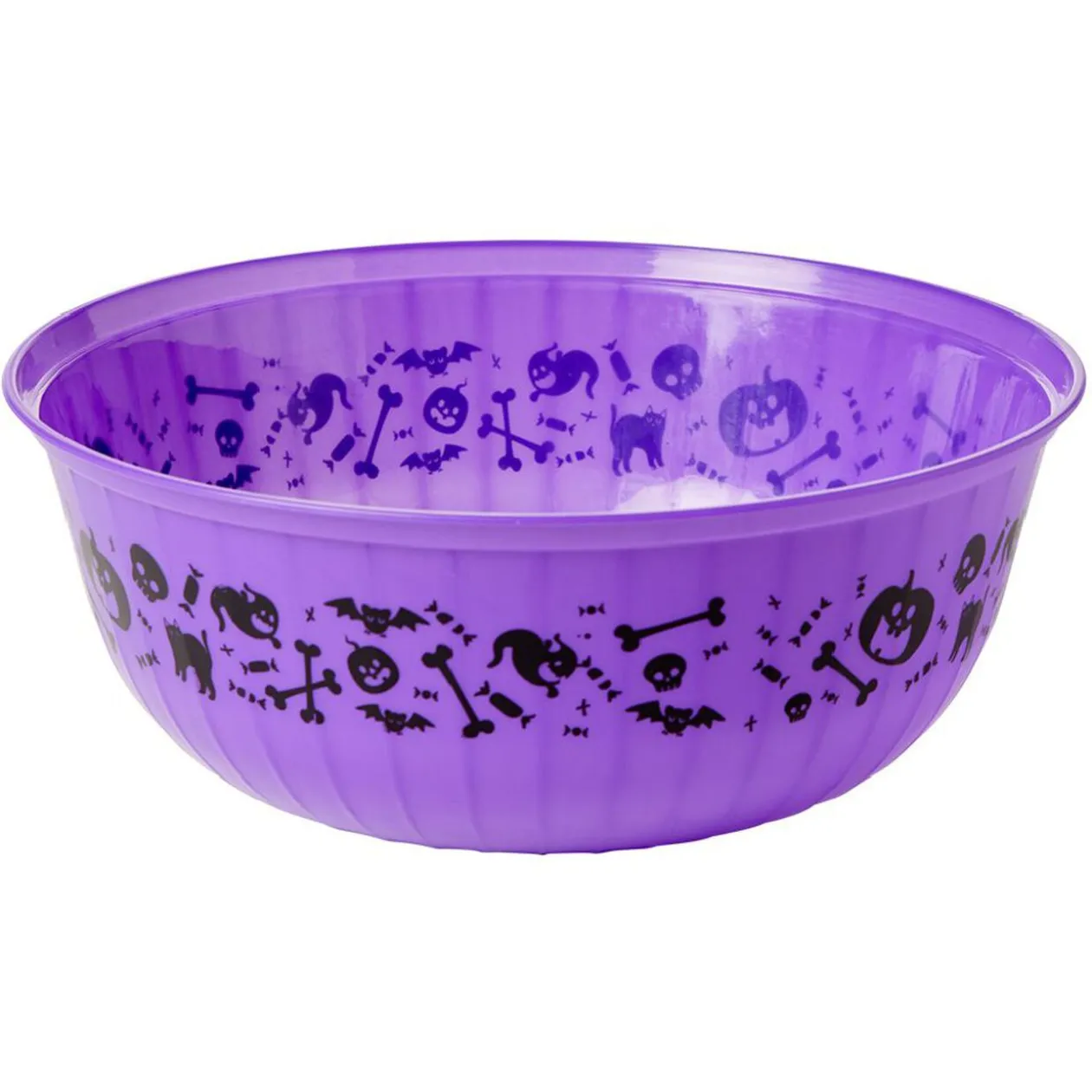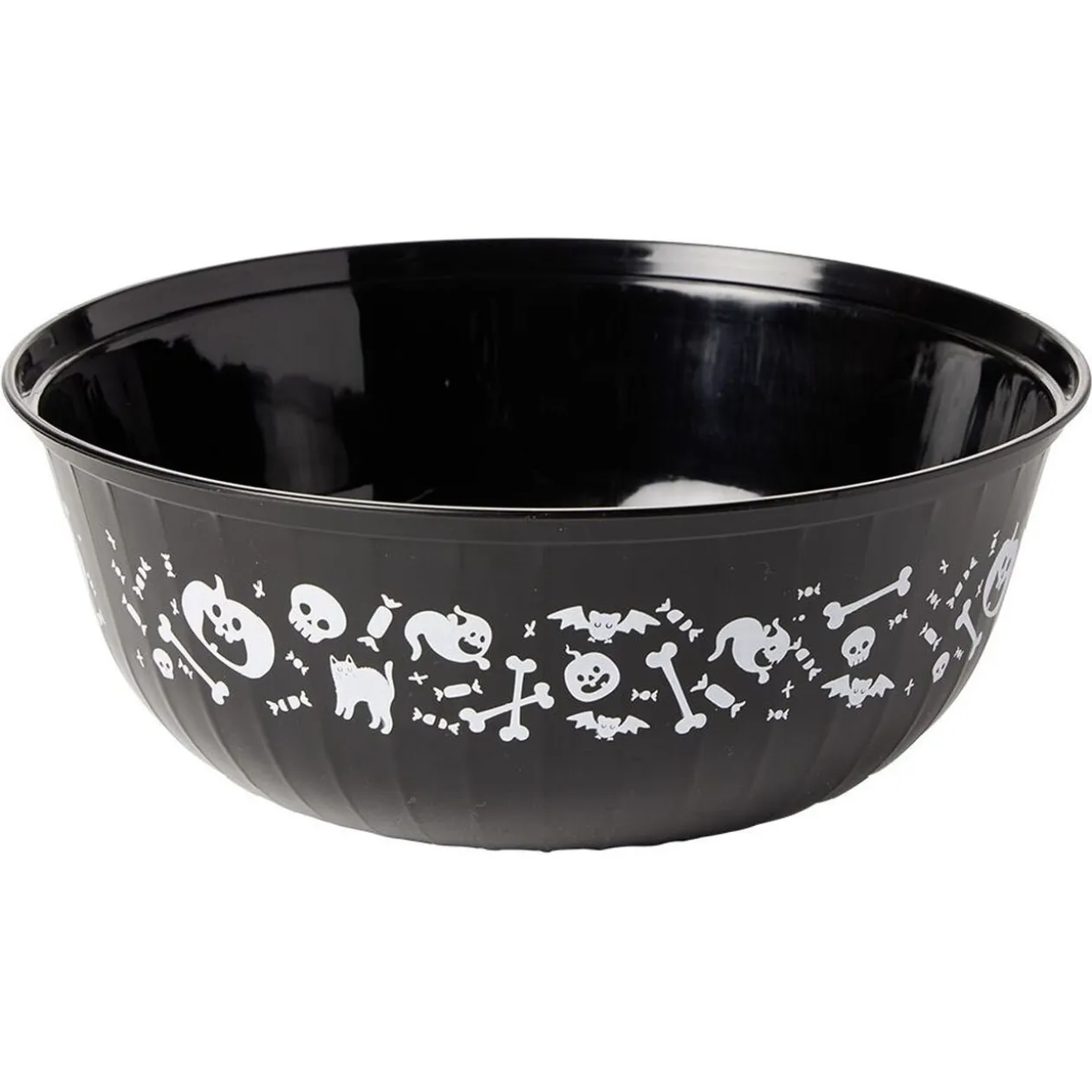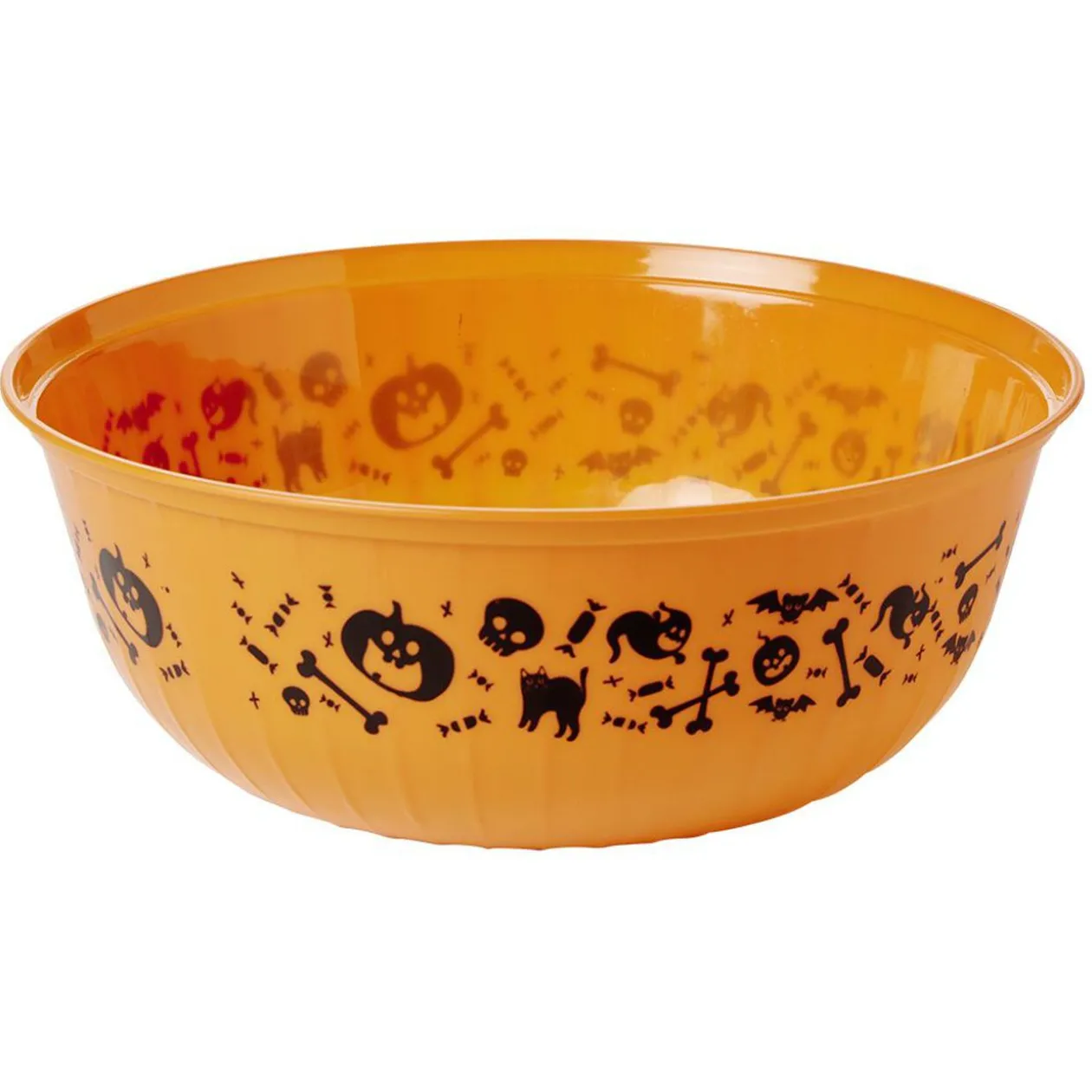 Bol en plastique coloré avec motifs citrouilles, os, têtes de mort… Idéal pour collecter les bonbons à l’occasion d’Halloween !