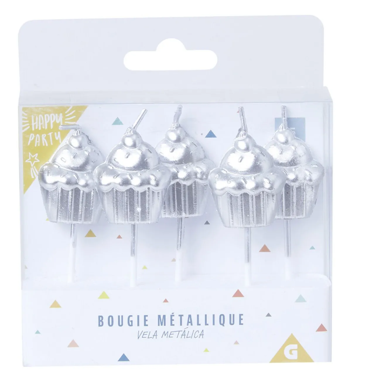 Lot de 5 bougies d’anniversaire en forme de cupcake de couleur argentée.