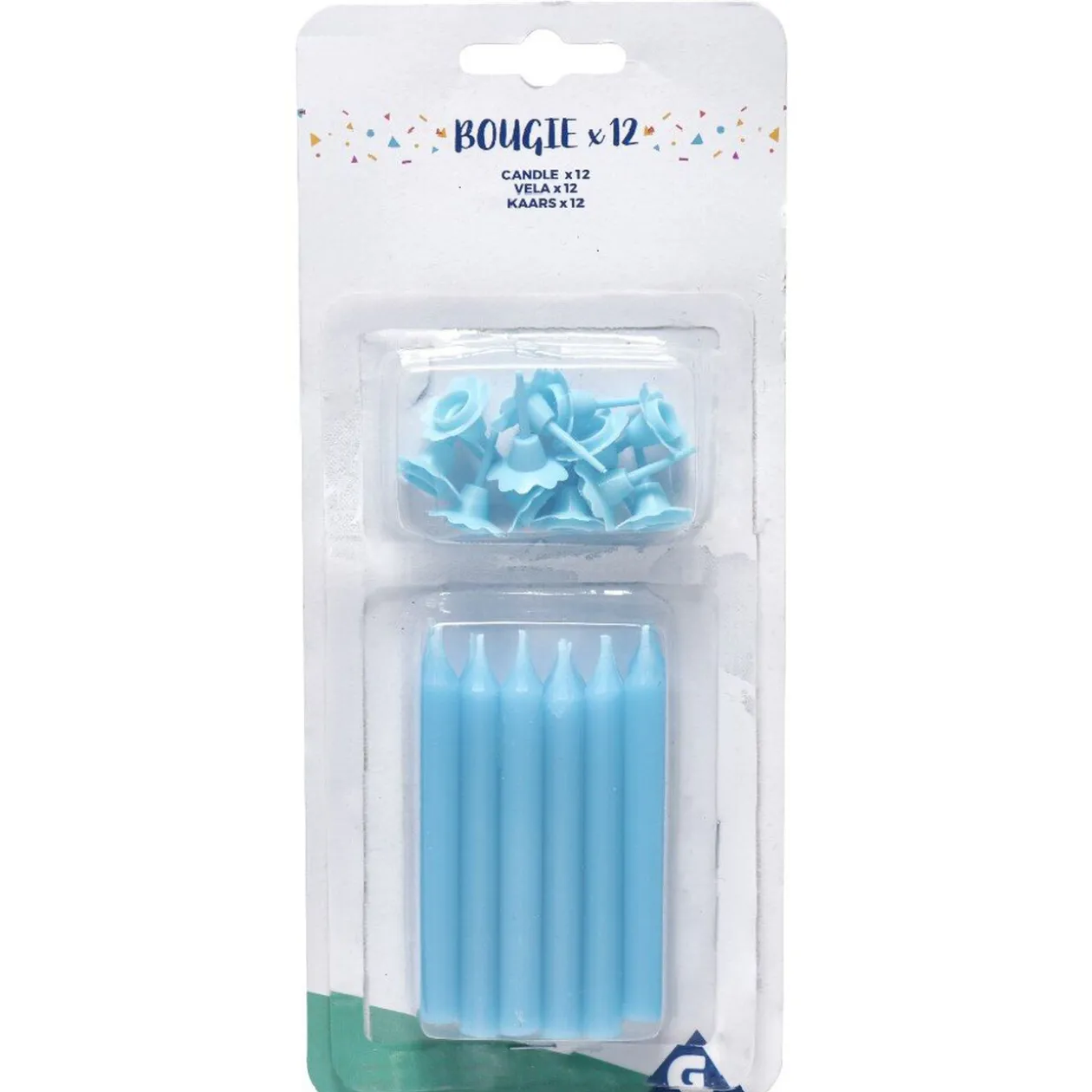 Lot de 12 bougies d’anniversaire en cire bleu avec supports assortis.Dimensions : 7cm de haut