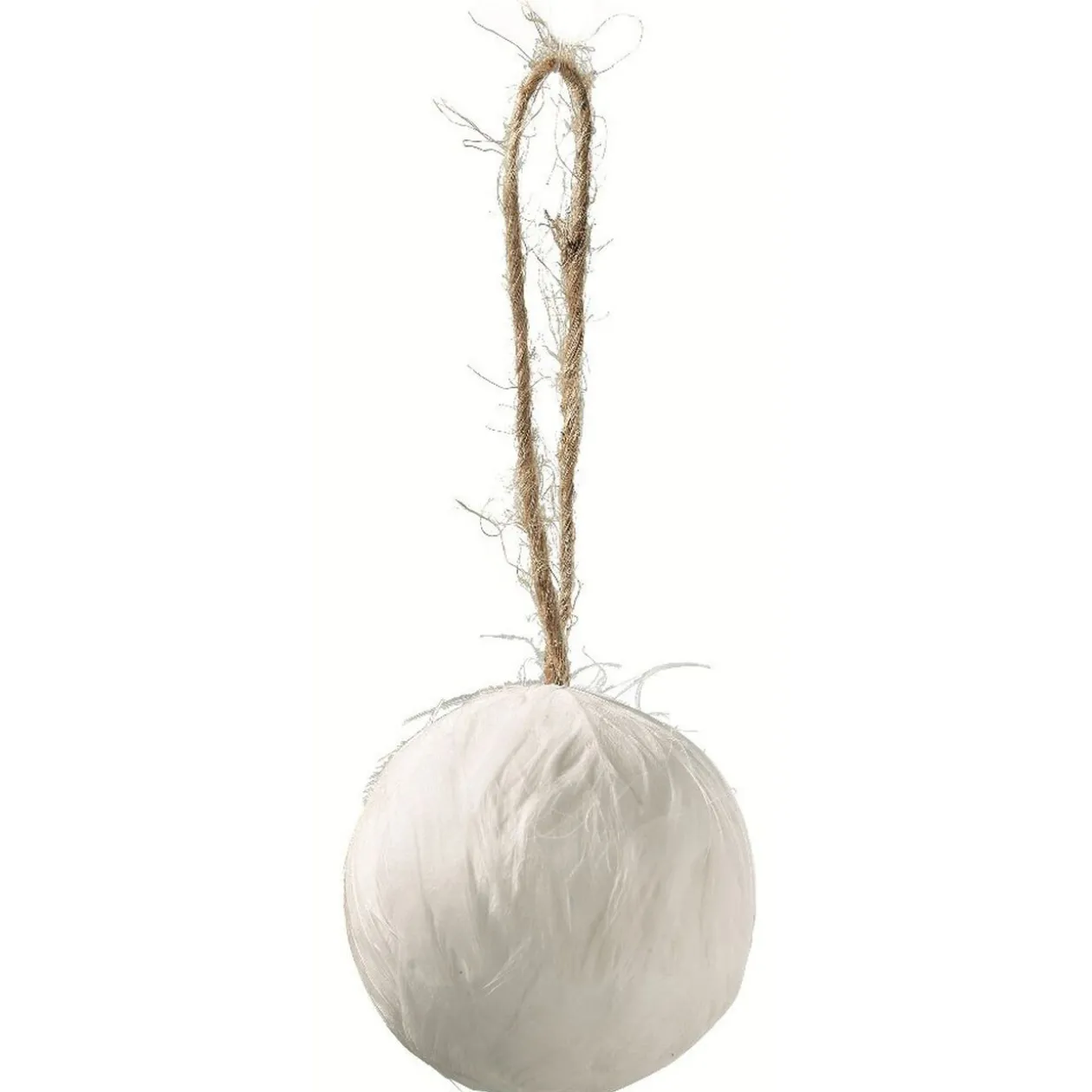 Boule de Noël recouverte de plumes et décoré d’un lien en jute.