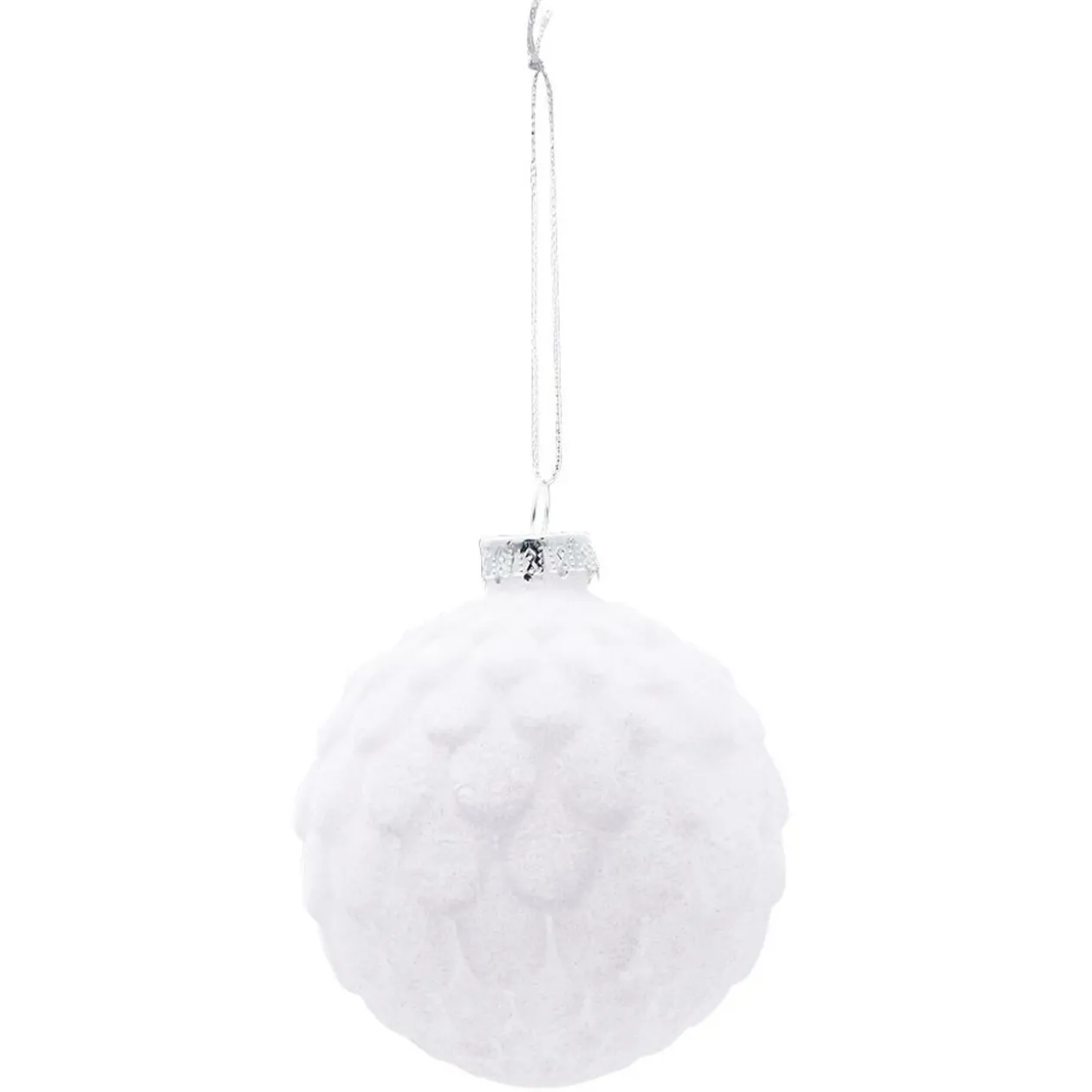 Boule de Noël blanche en verre avec une finition floquée pour un effet boule de neige, à suspendre au sapin.