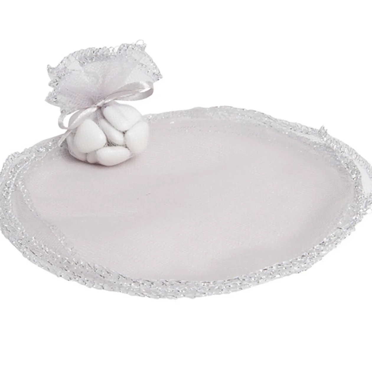 6 bourses rondes à dragées avec ruban, coloris argenté, ø 15 cm, polyester. Vendu sans dragées.