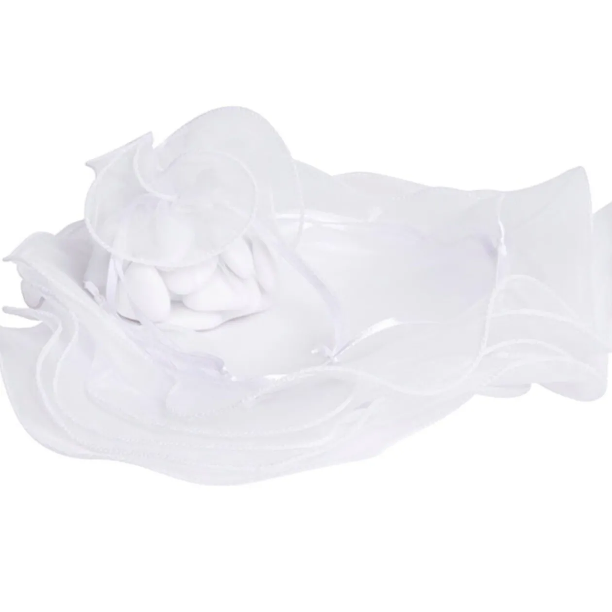 6 bourses rondes à dragées, coloris blanc, ø 24 cm, polyester et organza. Vendu sans dragées.