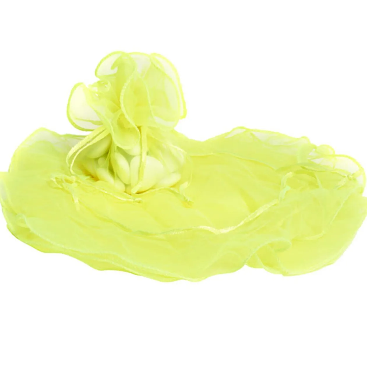 6 bourses rondes à dragées avec ruban, coloris vert anis, ø 24 cm, polyester et organza. Vendu sans dragées.