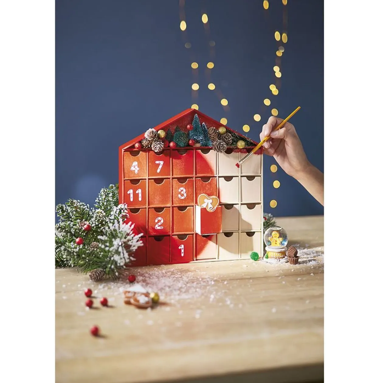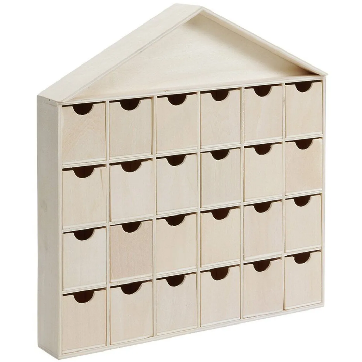 Calendrier de l’avent 24 cases en forme de maisonnette en bois.