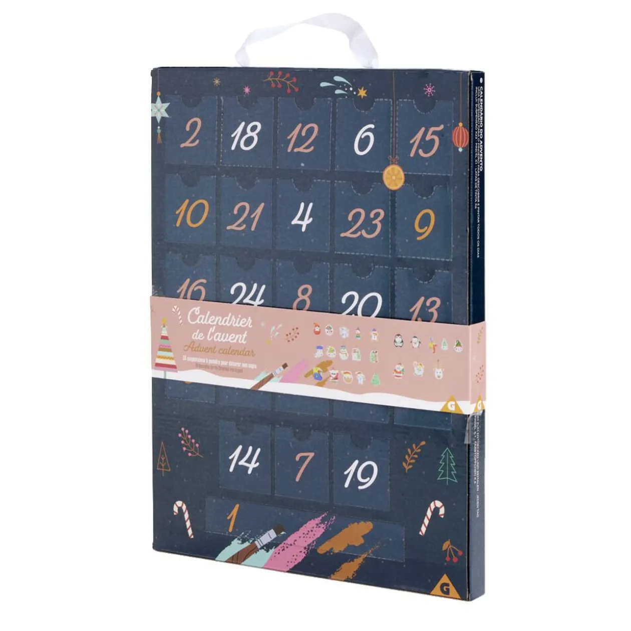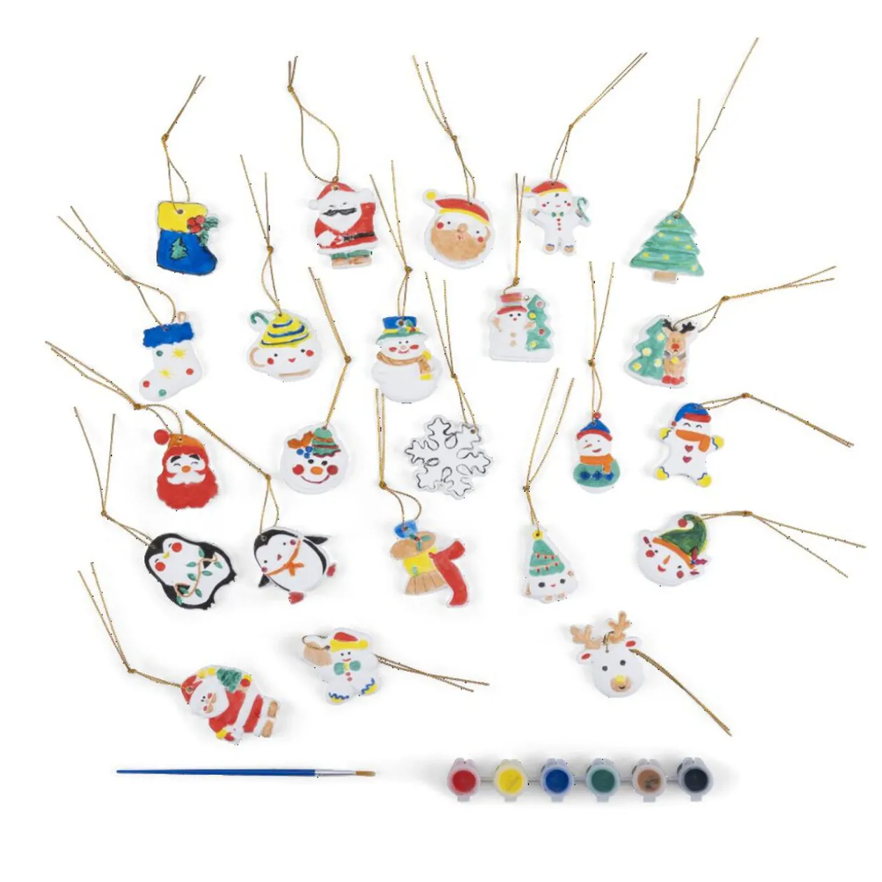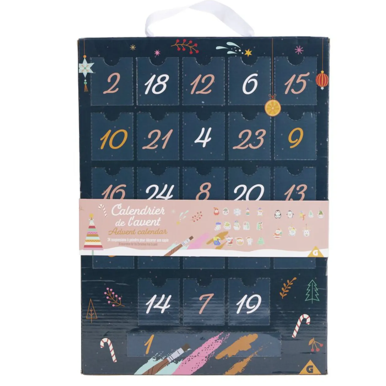 Découvrez la magie des fêtes avec ce calendrier de l’avent comprenant 23 suspensions à peindre, 6 pots de peinture, et 1 pinceau.
