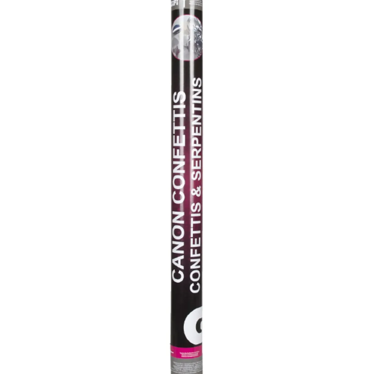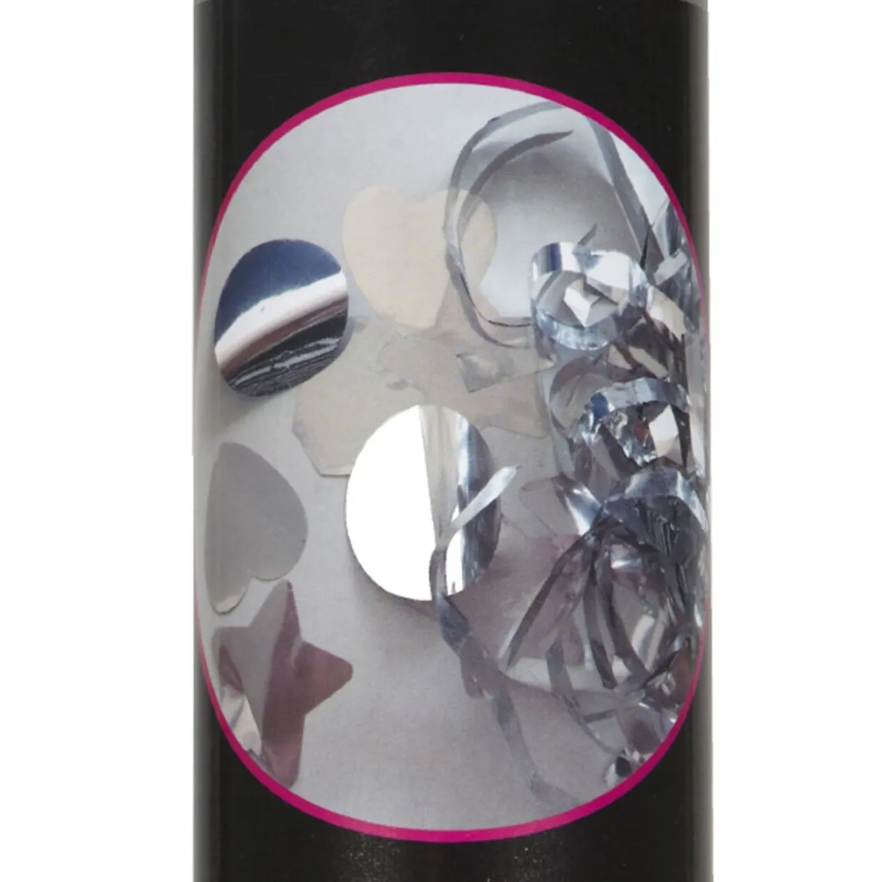 Canon à confettis et serpentins argentés, h. 60 cm, plastique et carton.