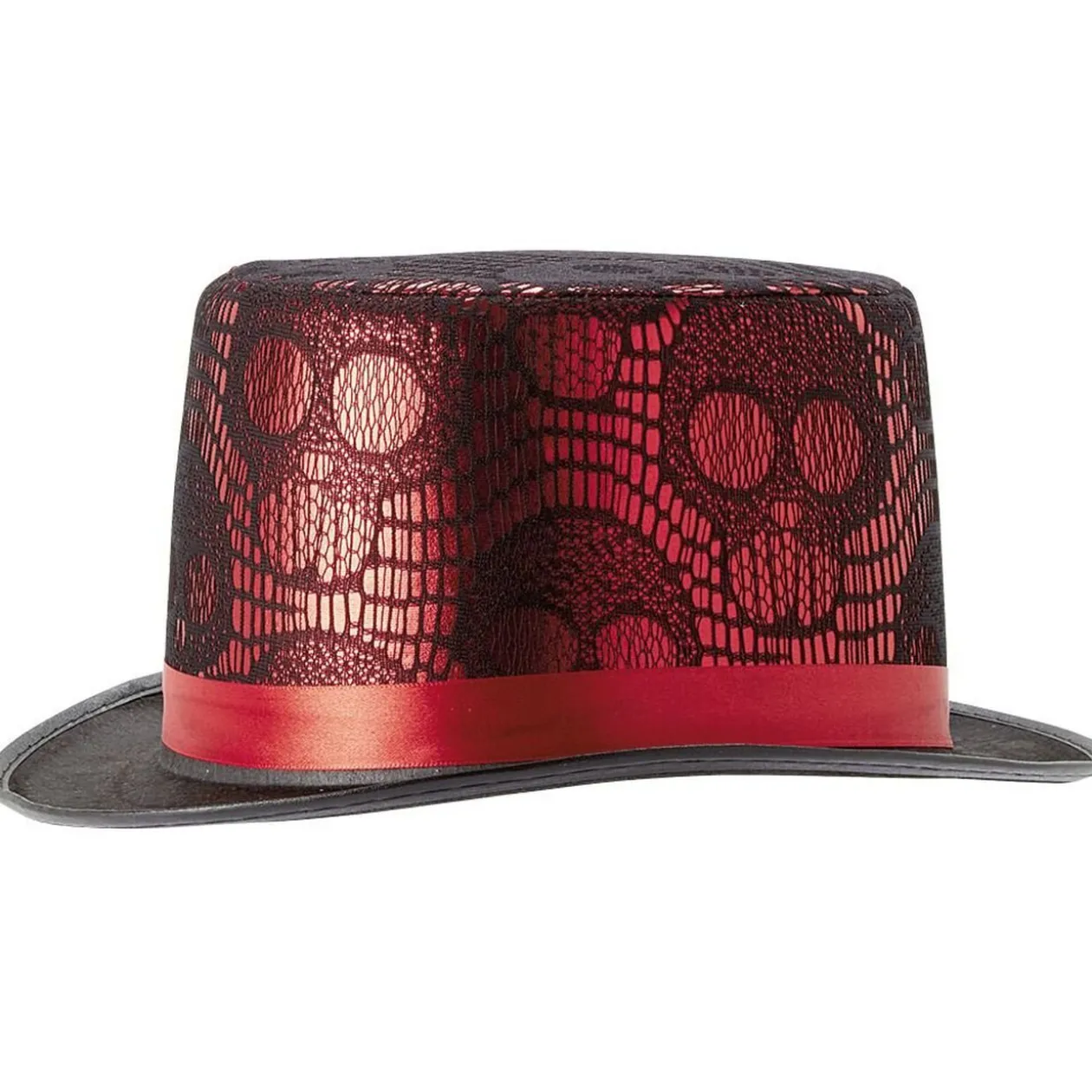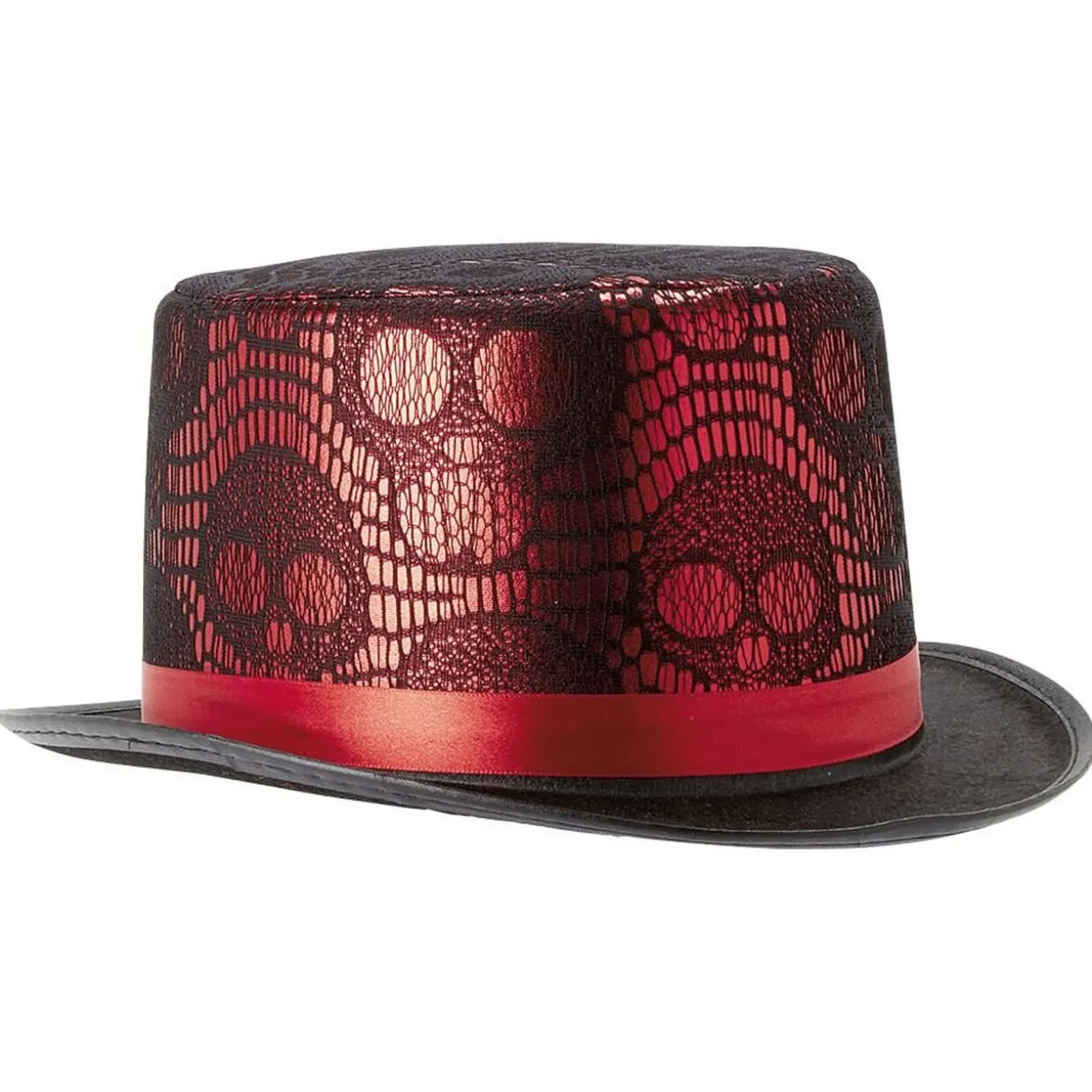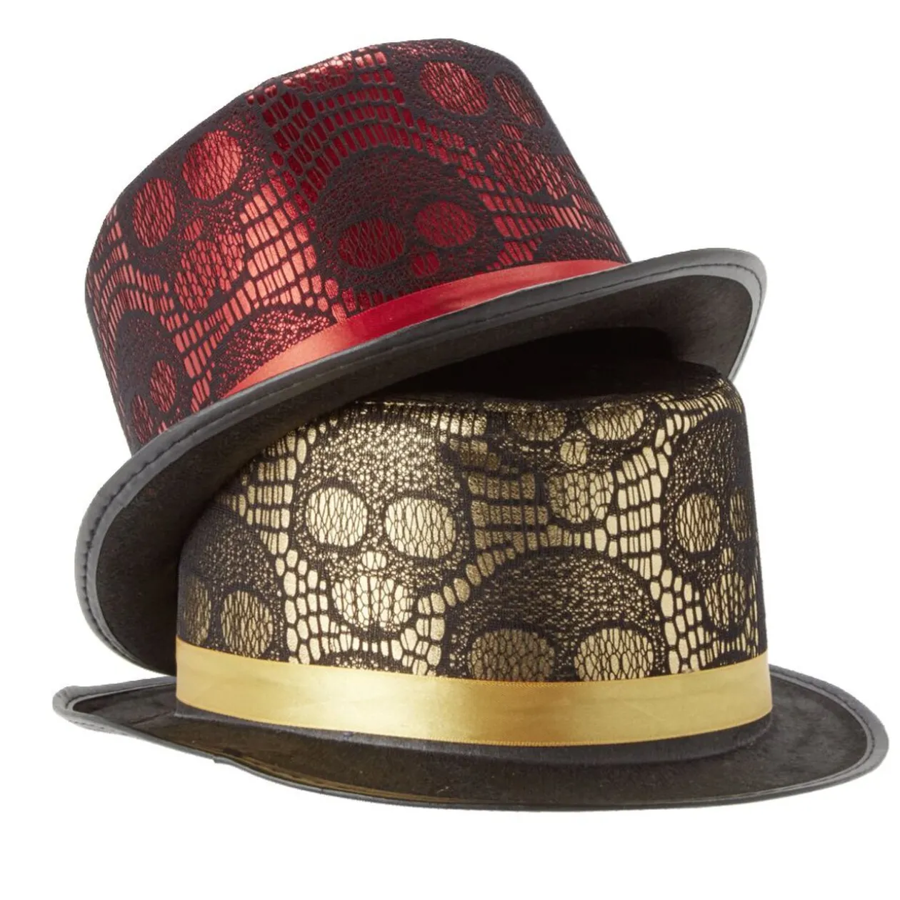 Un chapeau brillant en polyester avec des têtes de mort comme motif. Idéal pour déguisement d’Halloween.<bDisponibilité des coloris selon stock en magasin.