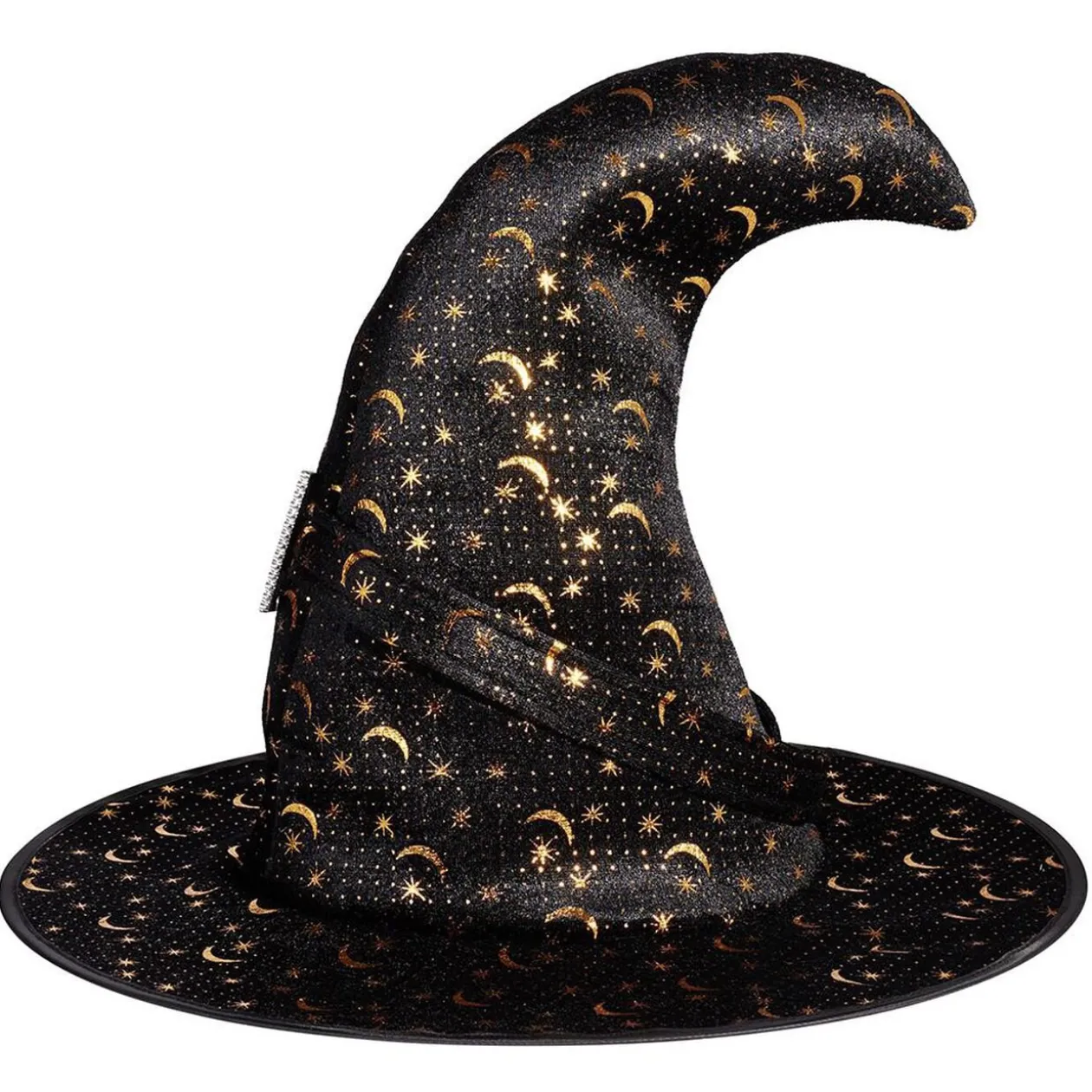 Un chapeau brillant de sorcière en polyester noir avec motifs dorés. Idéal pour déguisement d’Halloween.<b