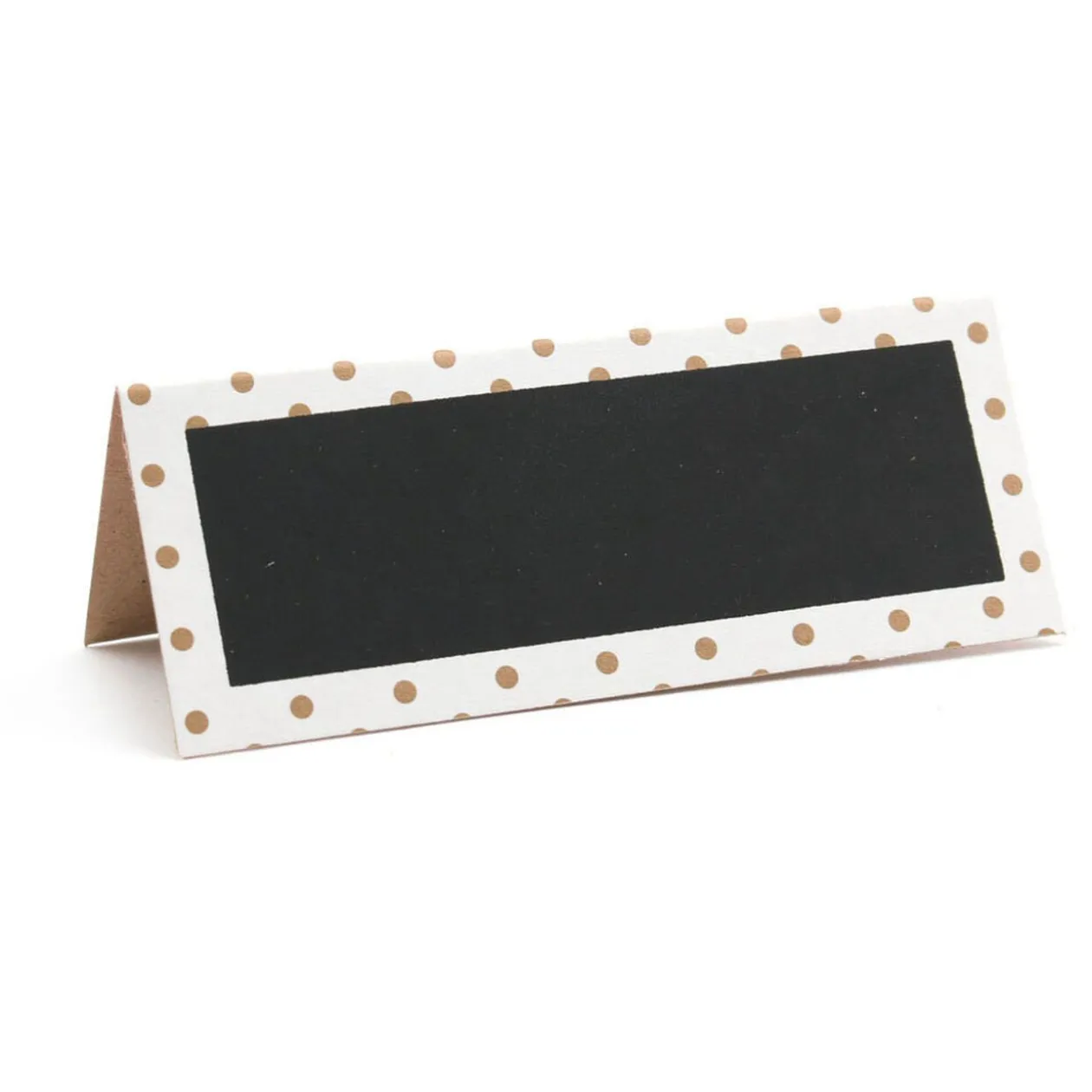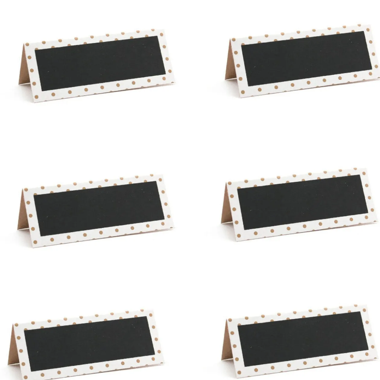 Lot de 6 chevalets marque-place en ardoise à bord blanc et pois dorés.