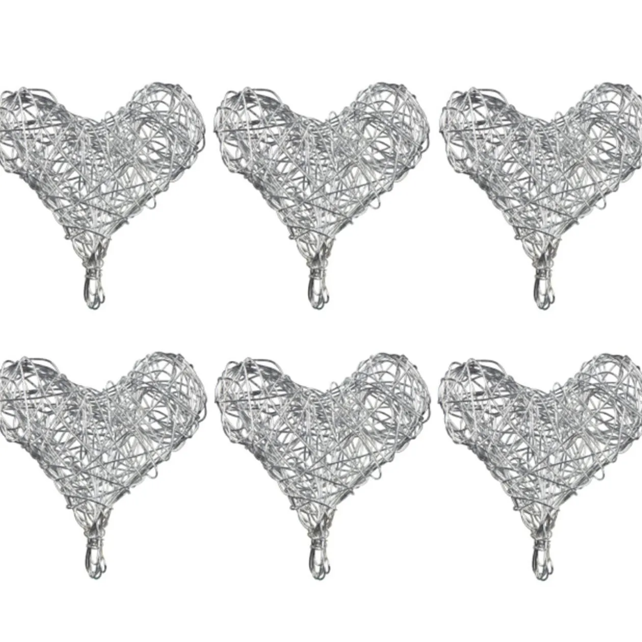 6 coeurs argenté, dim. 6×6,5 cm, métal. Peut s’utiliser en décoration pour mariage ou autre évènement.