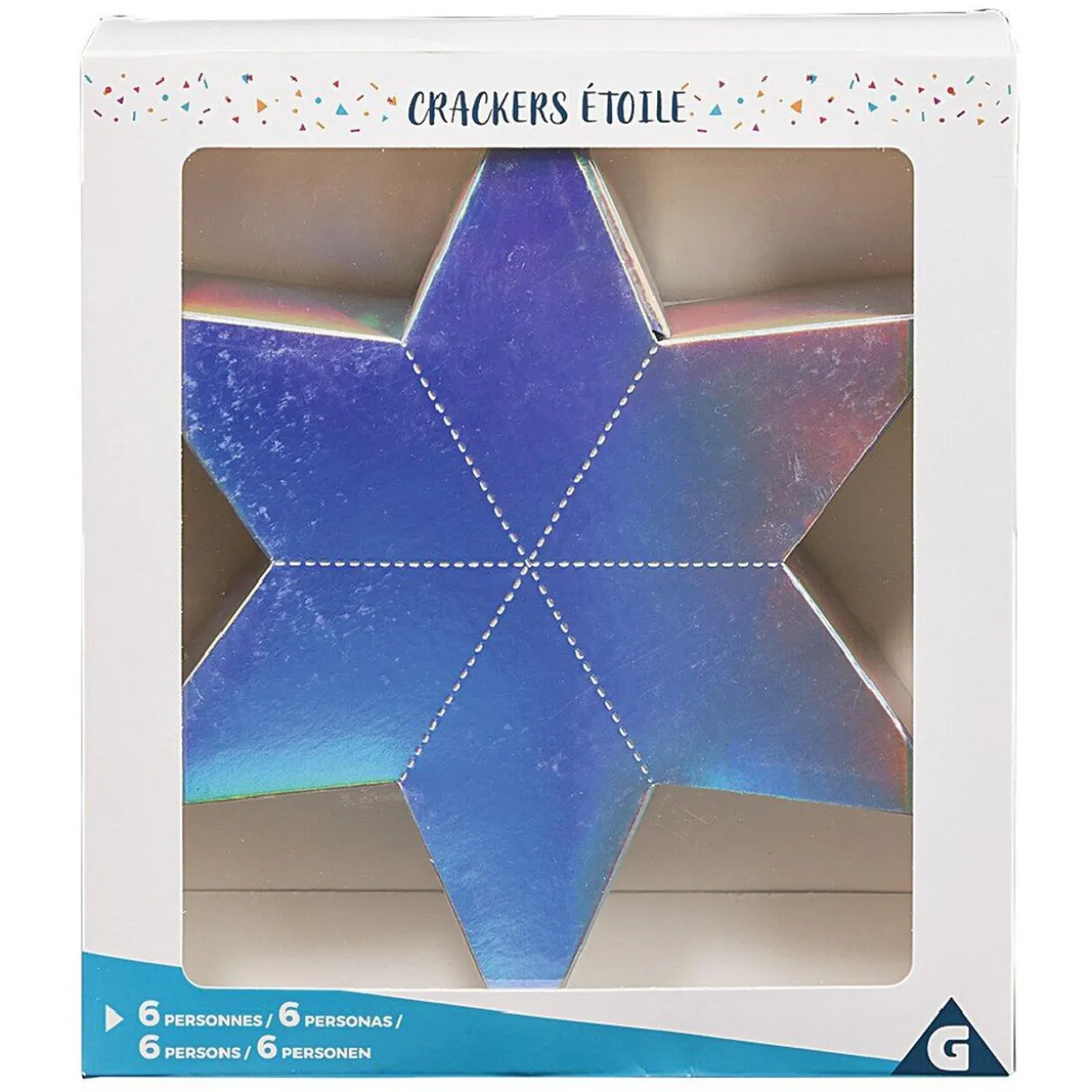 Lot de 6 crackers argentés formant une étoile une fois regroupés. Chaque crackers contient une couronne et un voeux. Idéals pour les fêtes de fin d’année.