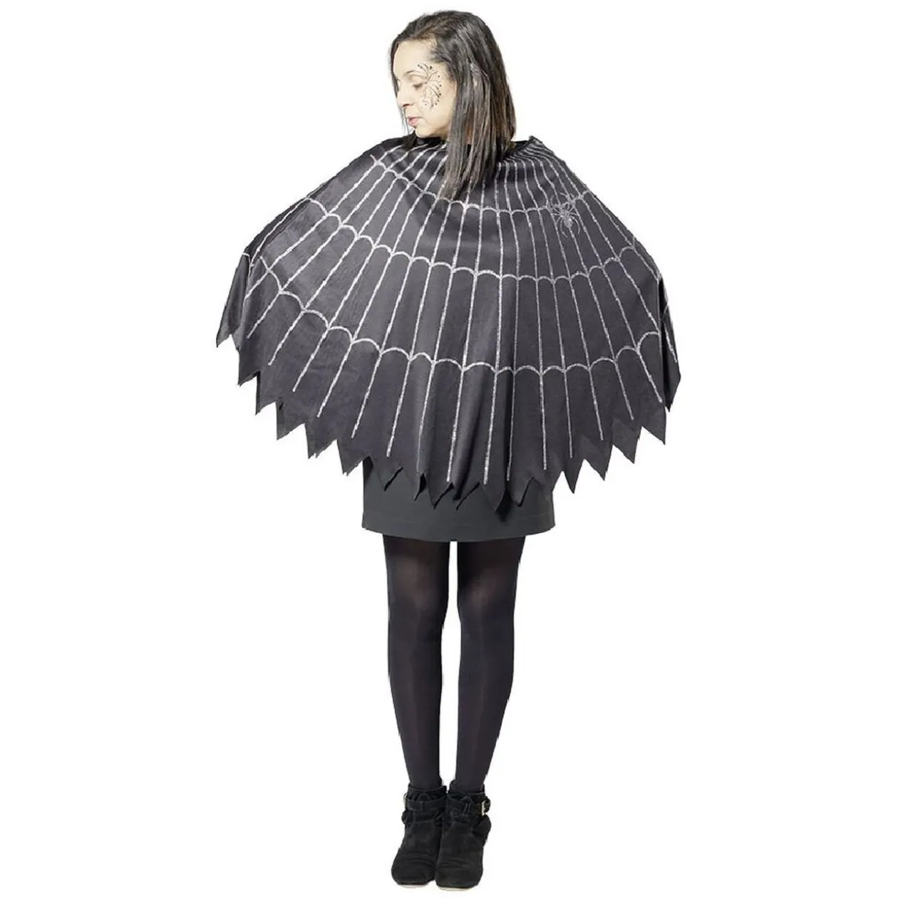Participez vous aussi à la fête d’Halloween en vous déguisant avec ce poncho noir à imprimé toile d’araignée gris pailleté.