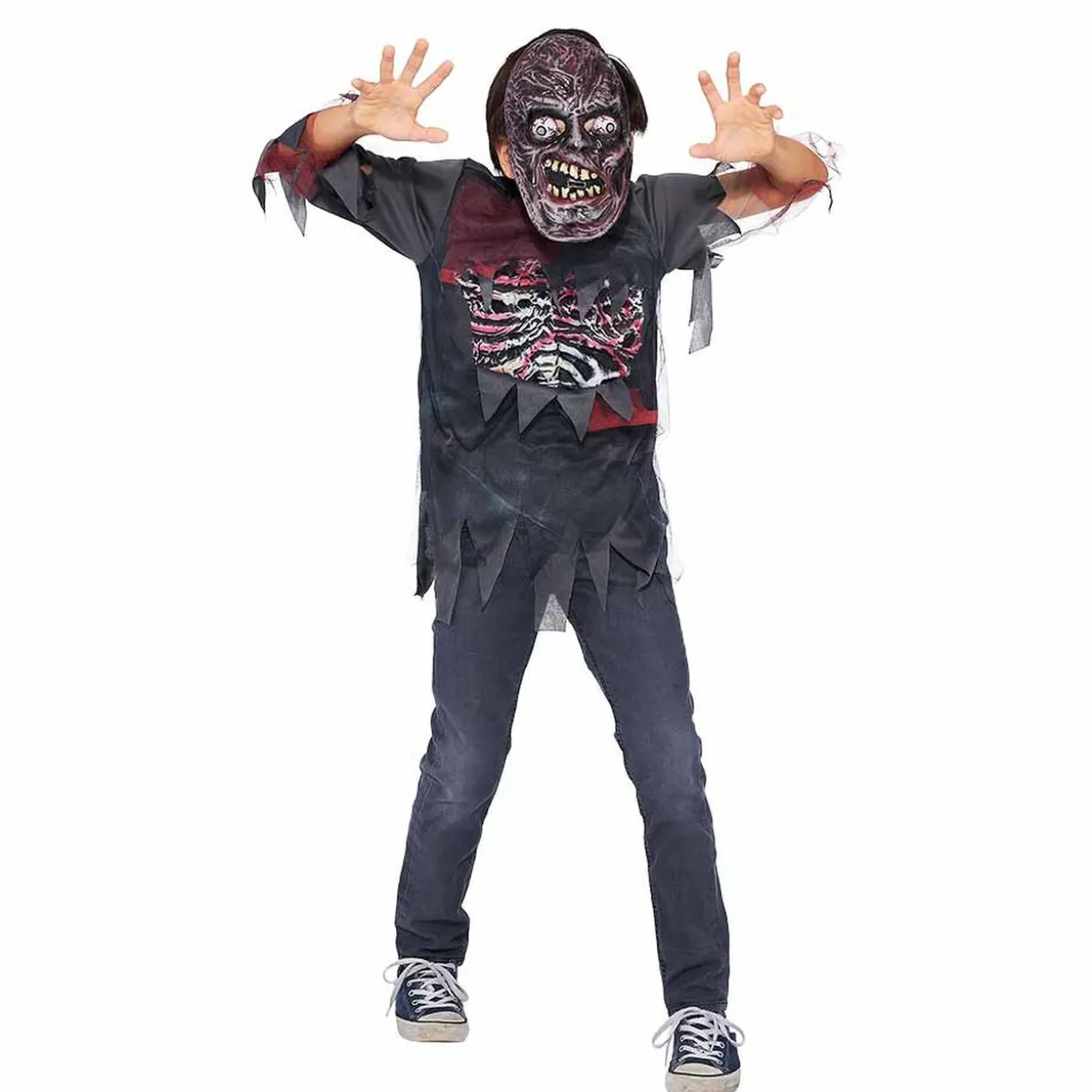 Avec ce déguisement squelette de zombie éventré et son masque aux yeux exorbités tu feras trembler de peur tes amis! Idéal pour s’amuser à Halloween et autre fête déguisée sur le thème de l’horreur.