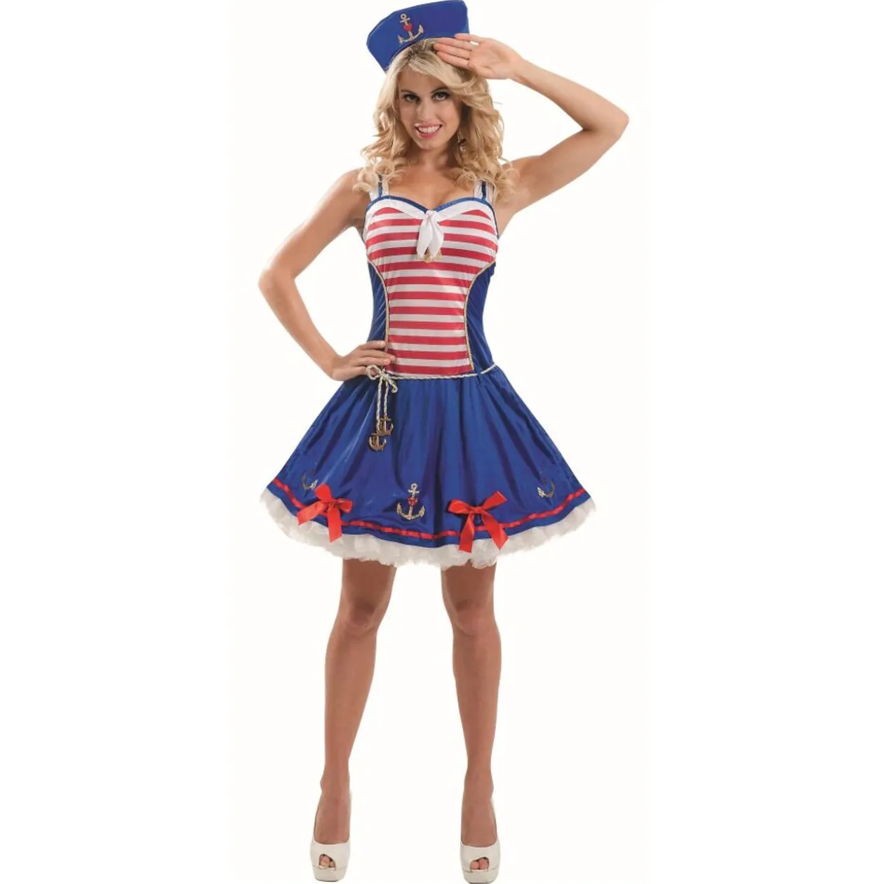 Déguisement femme marin comprenant 1 robe et 1 chapeau, polyester.