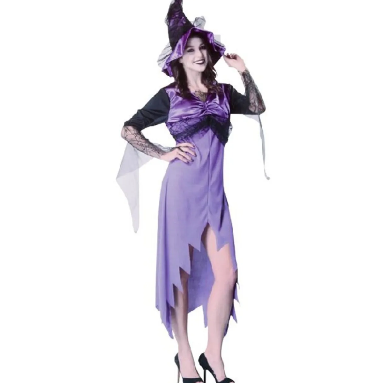 Déguisement femme de sorcière comprenant 1 robe et 1 chapeau, 100% polyester, taille unique.