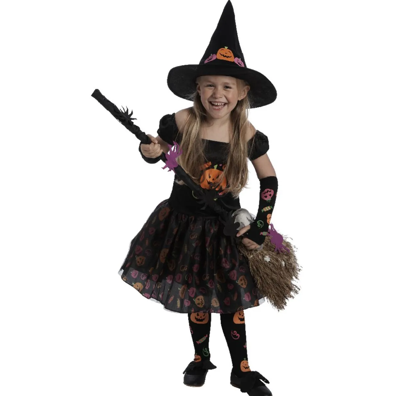 Idéal pour Halloween! Déguisement de sorcière pour fille imprimée citrouilles et bonbons.