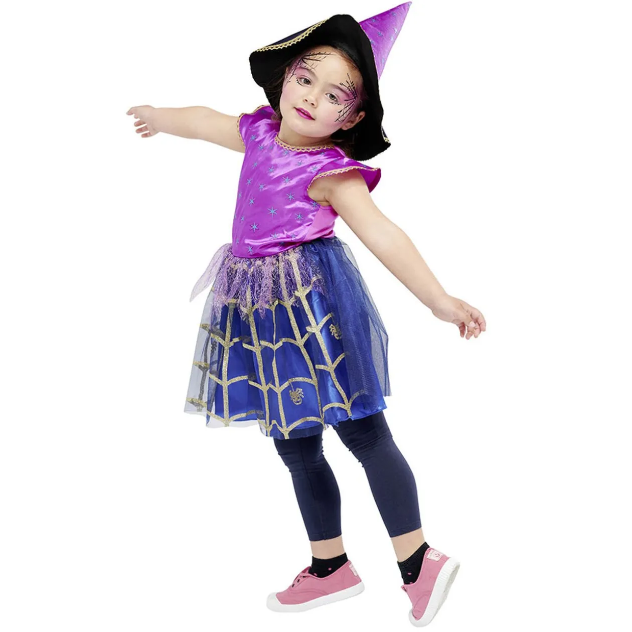 Un déguisement de sorcière à paillette pour enfant de 4/6 ans. Comporte un chapeau et une robe.