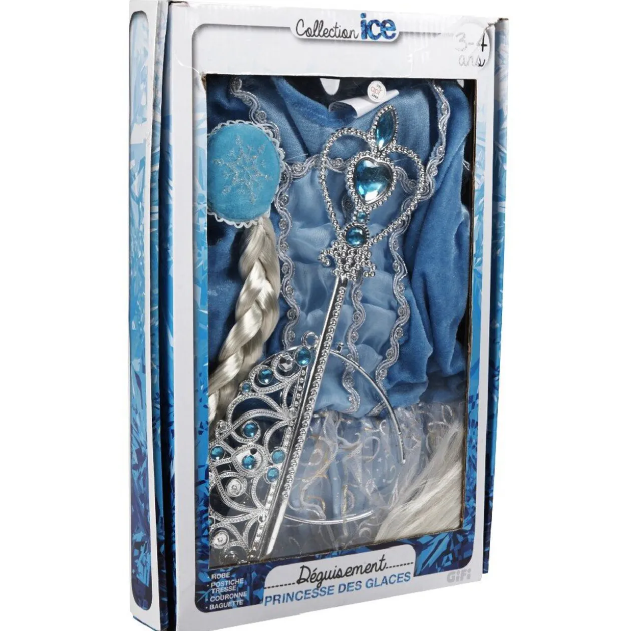 Déguisement princesse des glaces comprenant 1 robe bleue dim. 66×59 cm, 1 tresse L. 50 cm, 1 couronne dim. 17×17 cm et 1 baguette L. 32 cm, plastique et polyester.