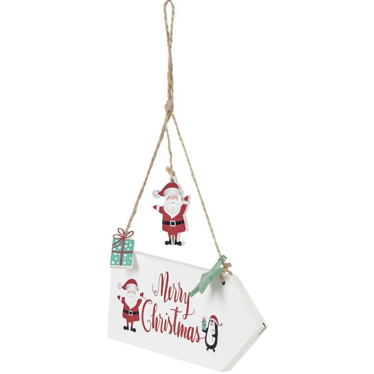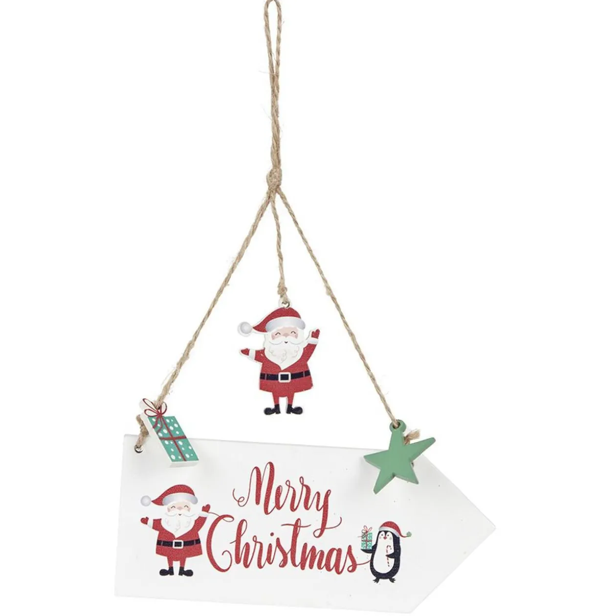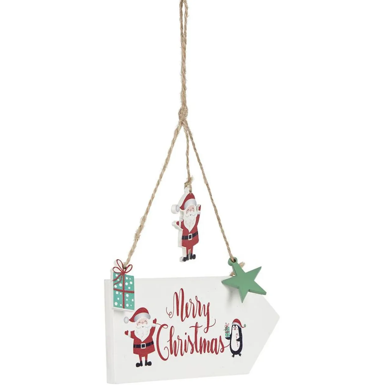 Pancarte blanche avec motif Père Noël, pingouin, étoile et cadeaux indiquant le chemin pour passer un joyeux Noël.