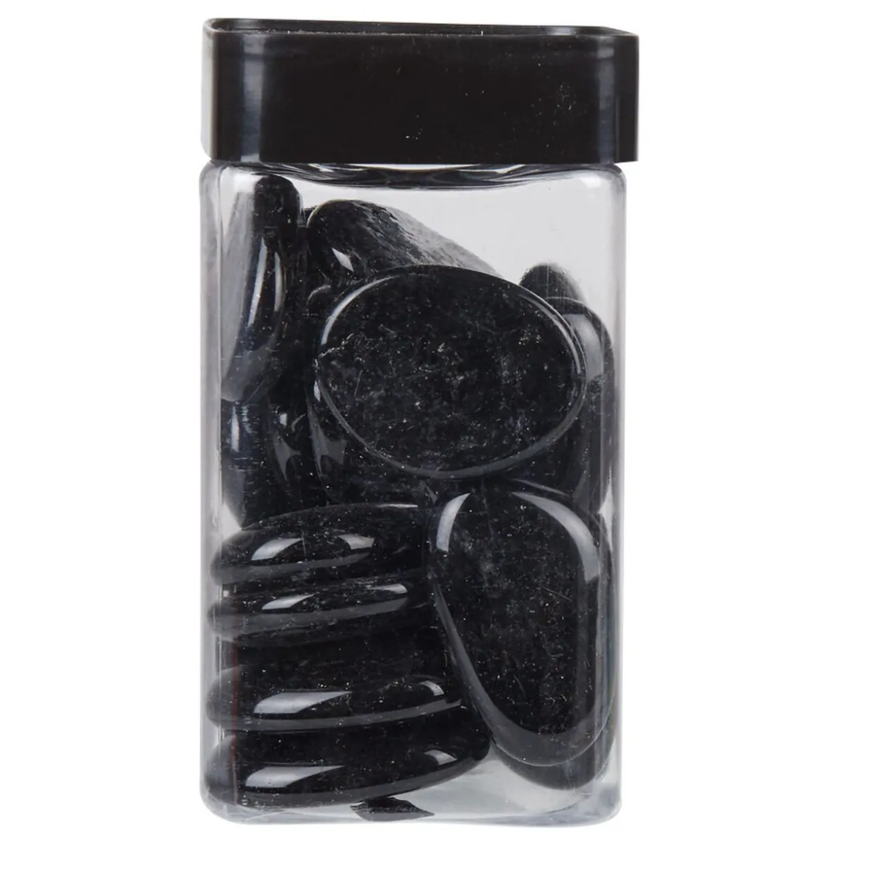 Boîte d’environ 20 galets décoratifs noires, cont. 400 gr, dim. 4×3 cm environ, verre.