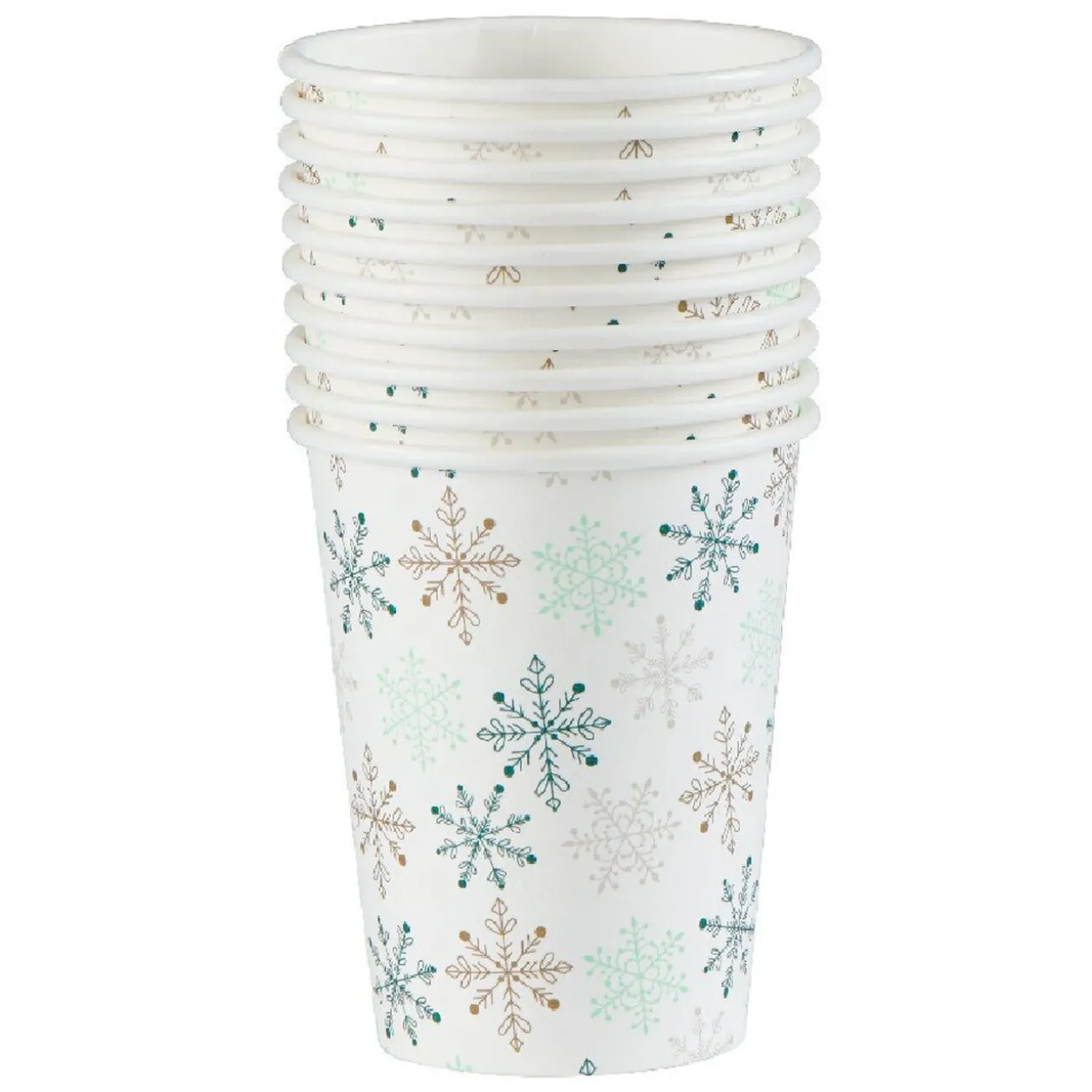 Lot de 10 gobelets jetables blancs avec motifs flocons de neige vert et gris, d’une contenance de 25 cl. N’hésitez pas à compléter votre table avec les assiettes jetables assorties, réf. 506948 !