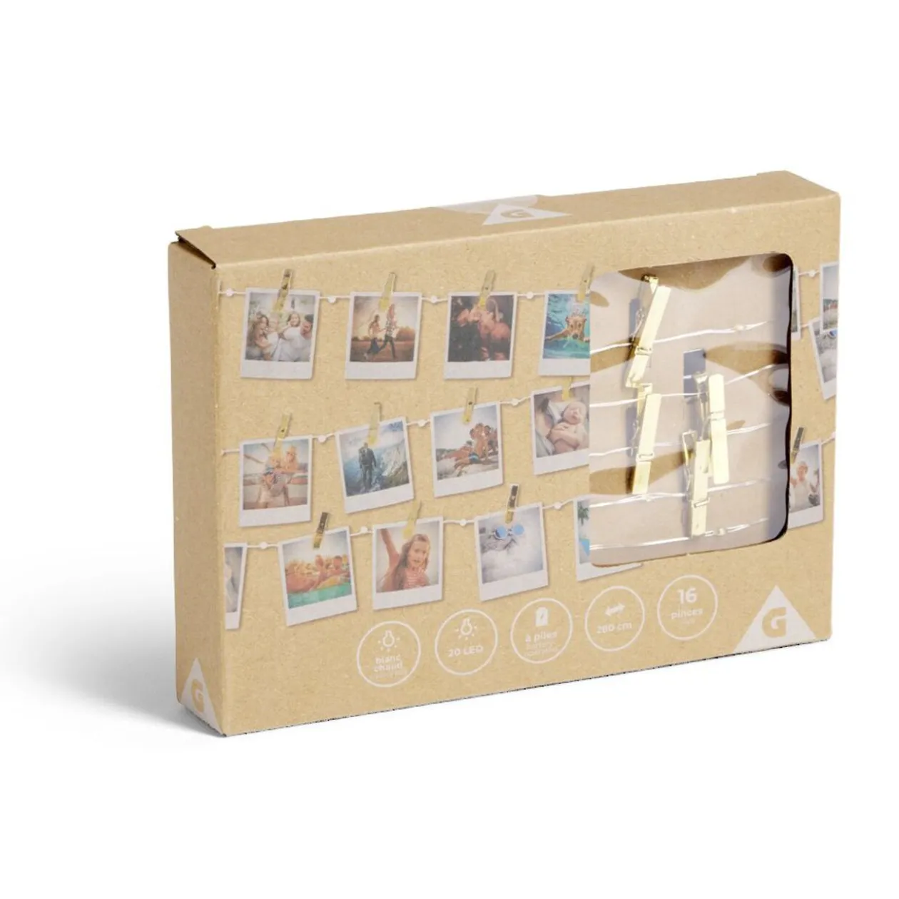 Cette guirlande lumineuse à pinces dorées est l’accessoire parfait pour afficher vos souvenirs préférés avec style.