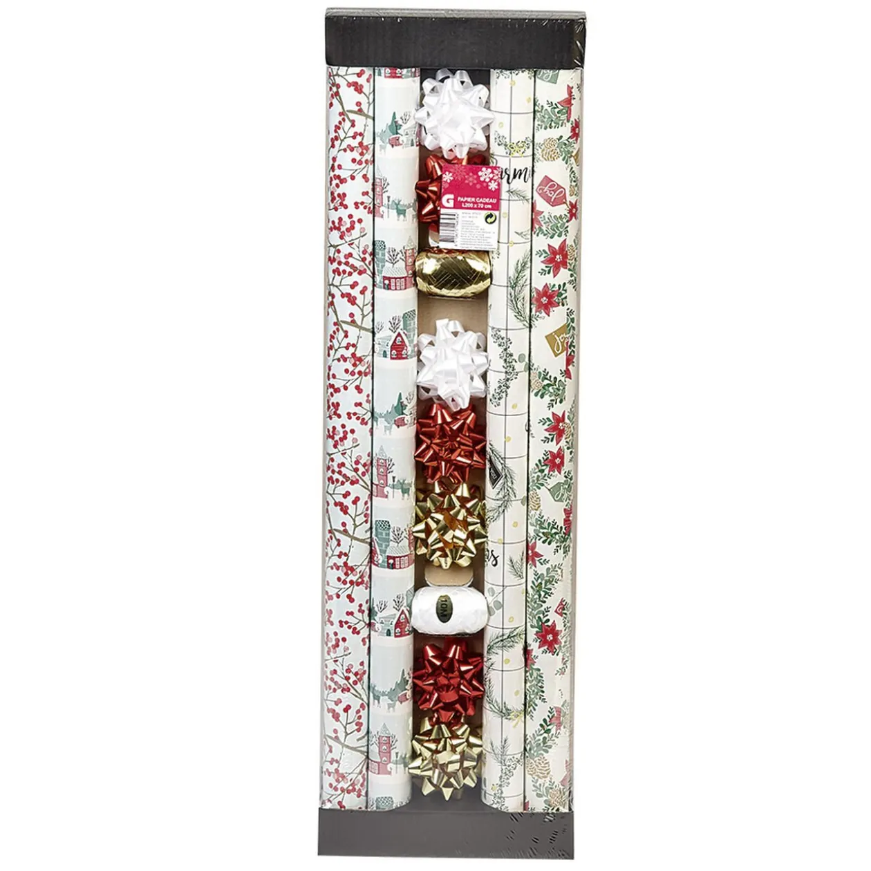 Pour emballer vos cadeaux de Noël, optez pour ce kit complet composé de 4 rouleaux de papier, 7 noeuds et 2 bolducs.