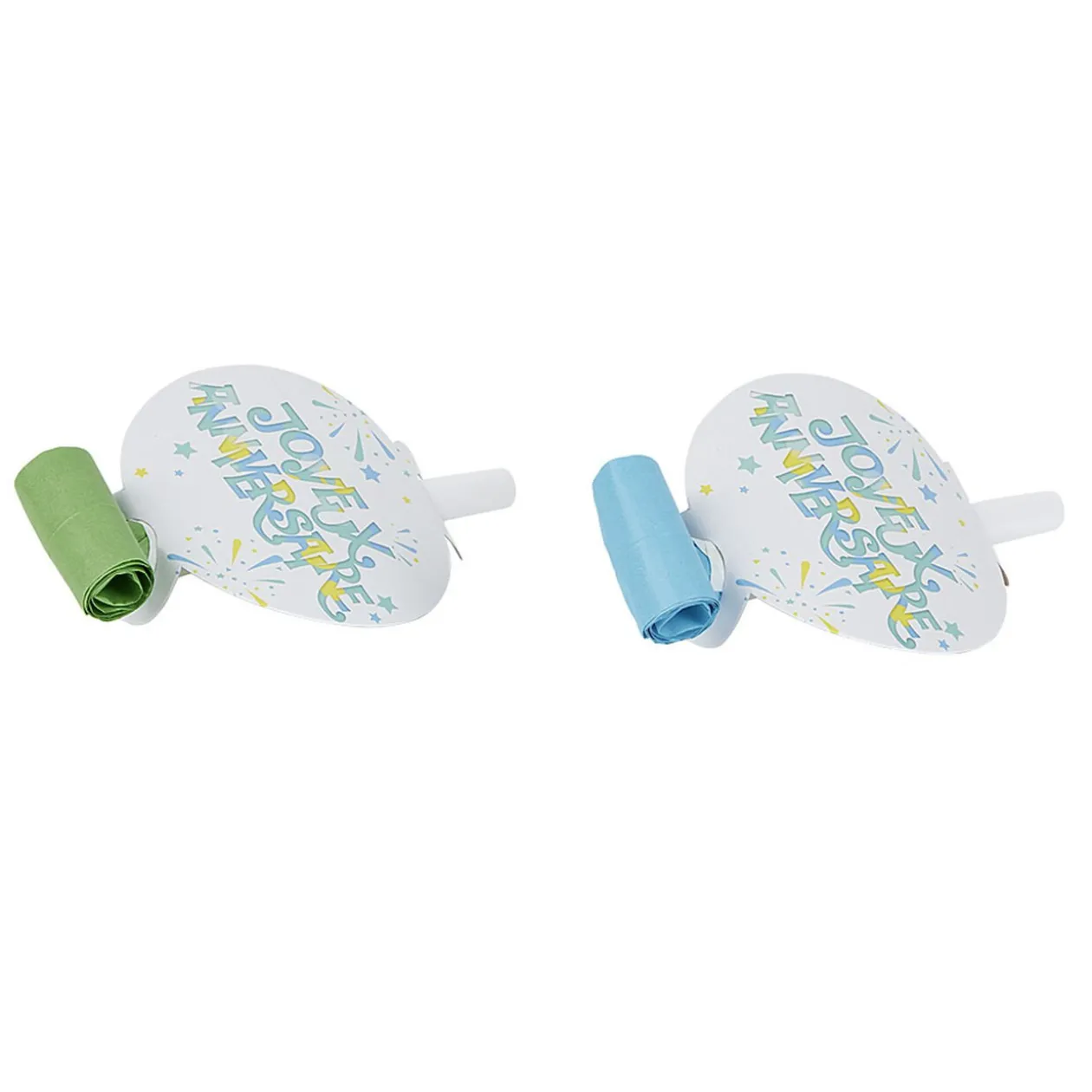 Faites du bruit avec ce lot de 8 langues de belle-mère. Elles sont accompagnées de 8 étiquettes avec l’inscription « Joyeux anniversaire » pouvant s’accrocher sur le sifflet.