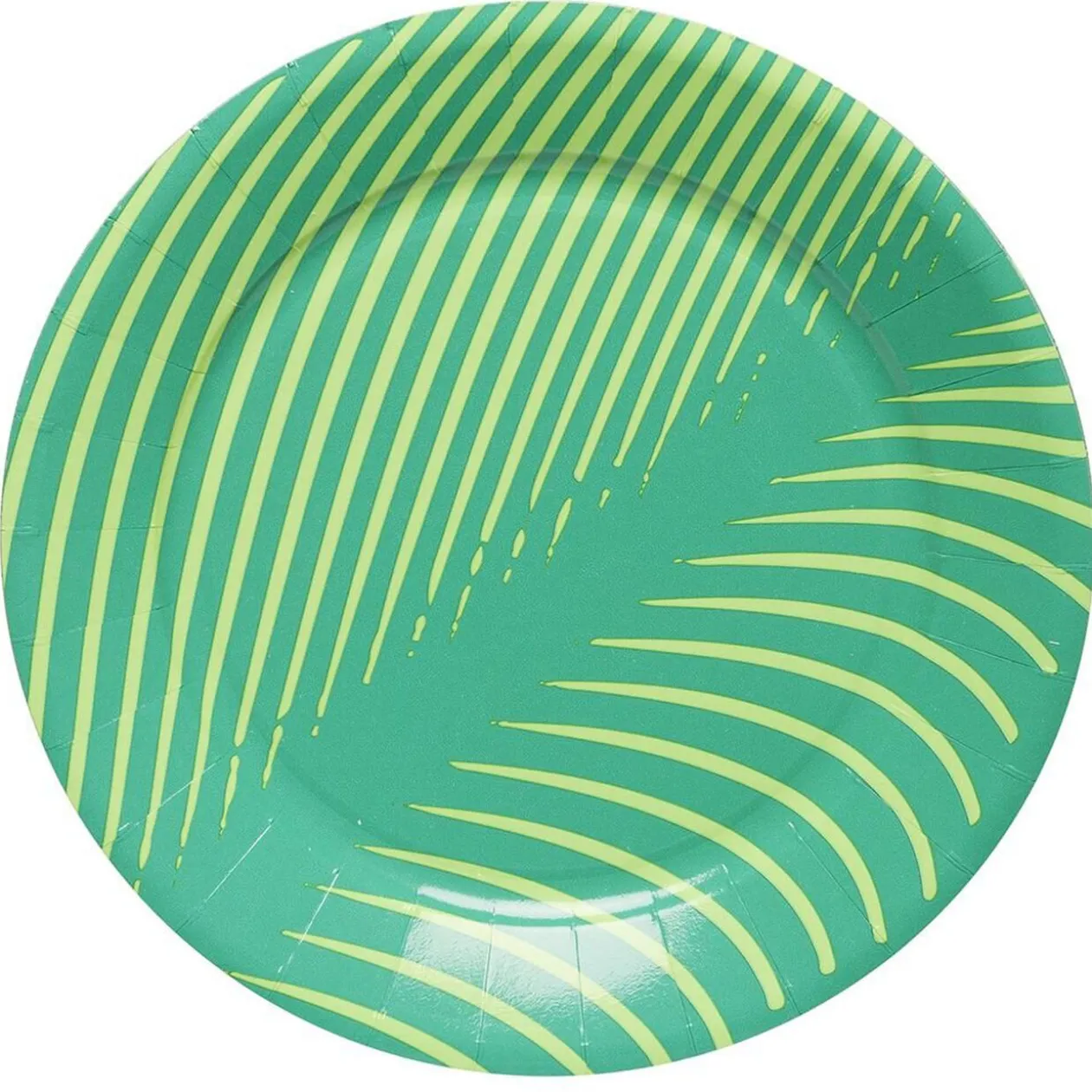 Lot de 10 assiettes en carton au motif feuille tropicale.