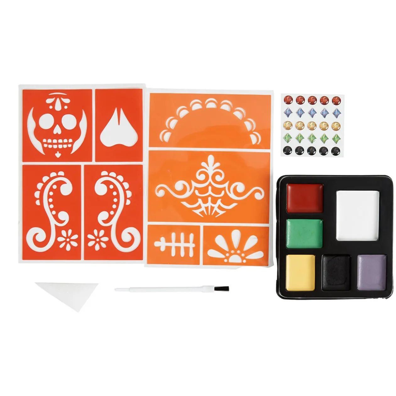 Kit de maquillage à l’eau 5 couleurs (blanc, violet, jaune, vert et noir), autocollants, 2 pochoirs, 1 éponge et 1 pinceau.