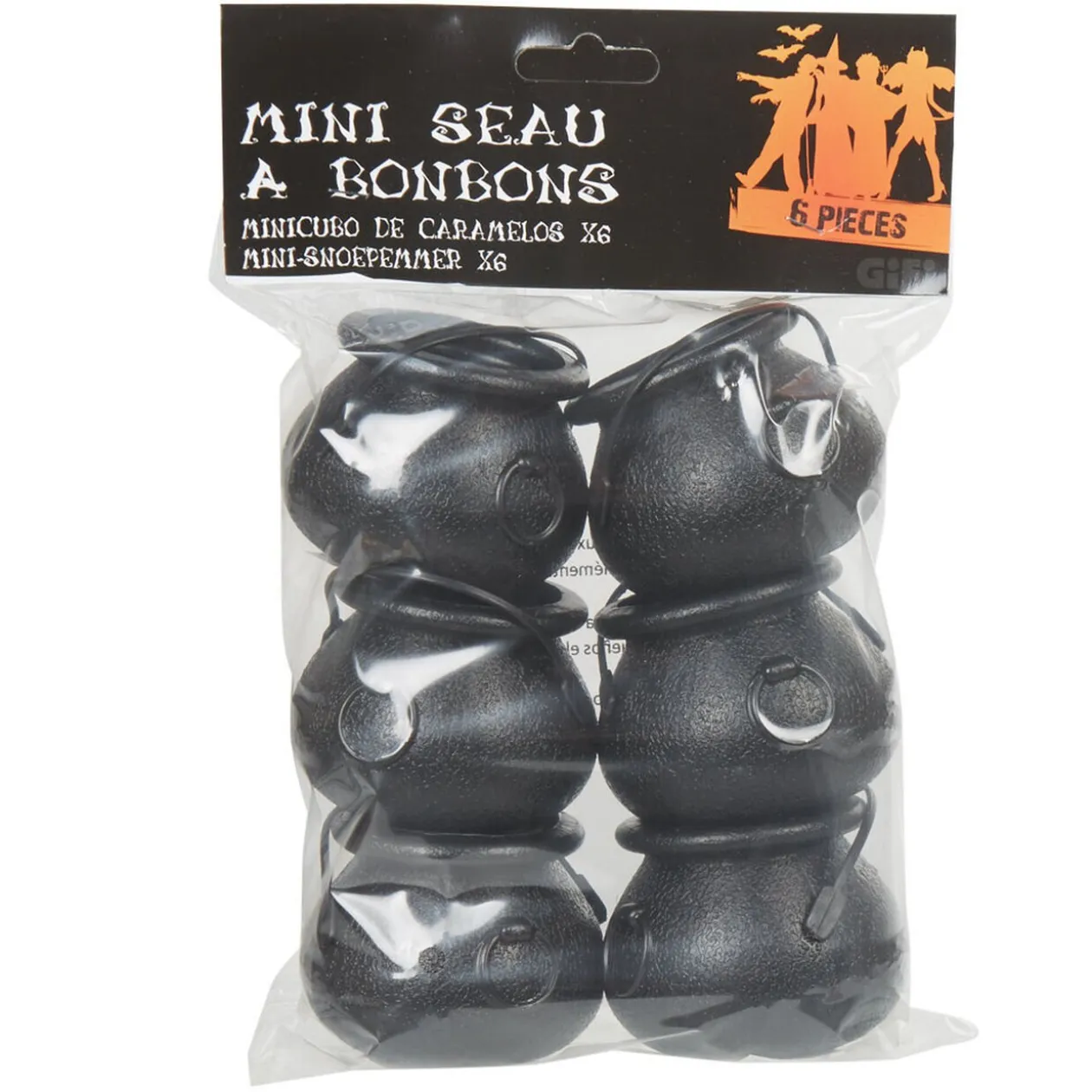 6 mini seaux à bonbons en forme de chaudron noir.