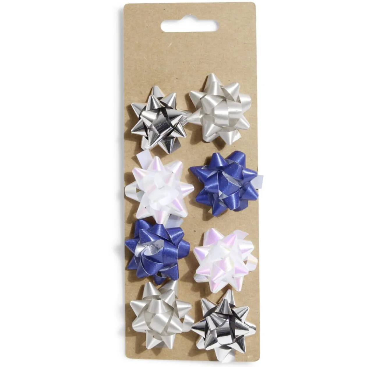 Lot de 8 noeuds en bolduc mat et brillant dont 2 argentés, 2 gris, 2 blancs iridescents et 2 bleus, indispensable à vos emballages cadeaux pour apporter la petite touche finale.