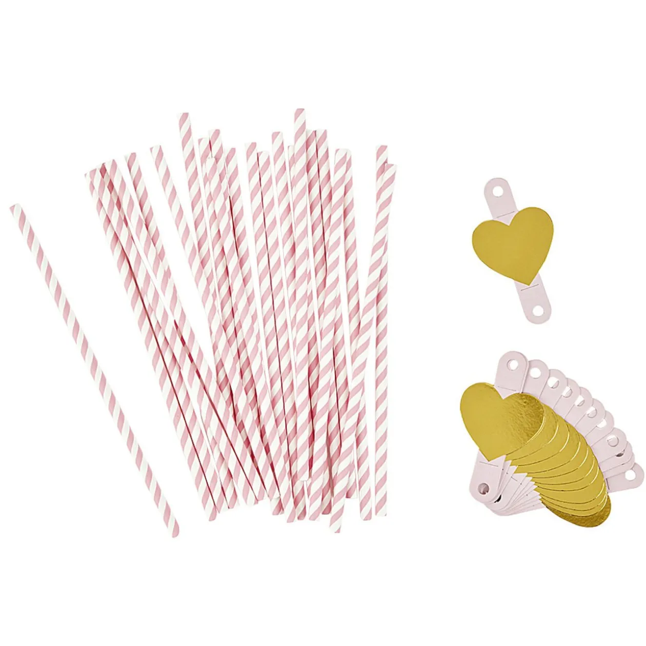 Ne vous trompez plus en prenant le verre de votre voisin grâce à ces pailles rose et blanche et leurs étiquettes en forme de coeur doré.
