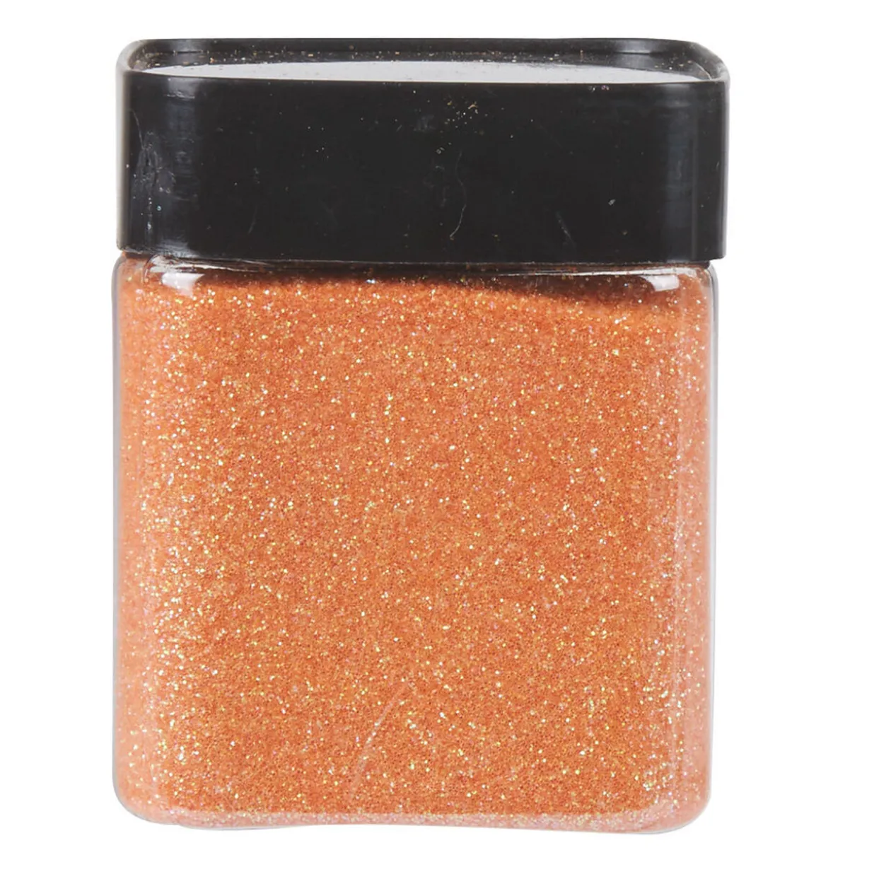 Boîte de paillettes décoratives oranges, cont. 165 gr, plastique.
