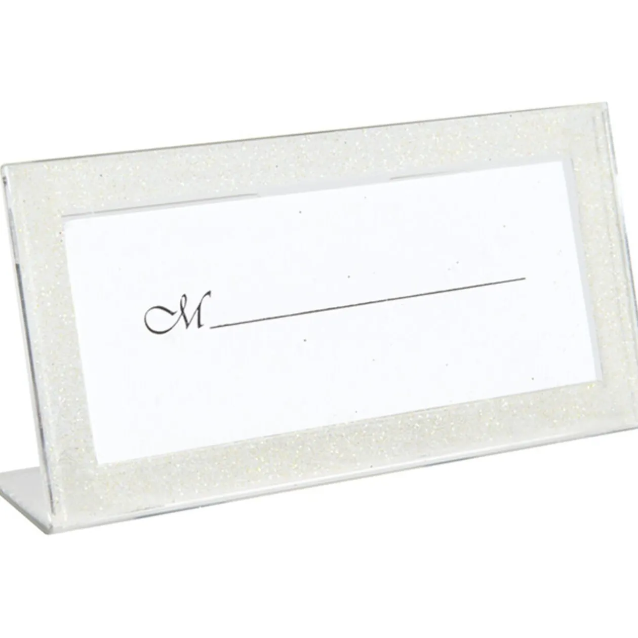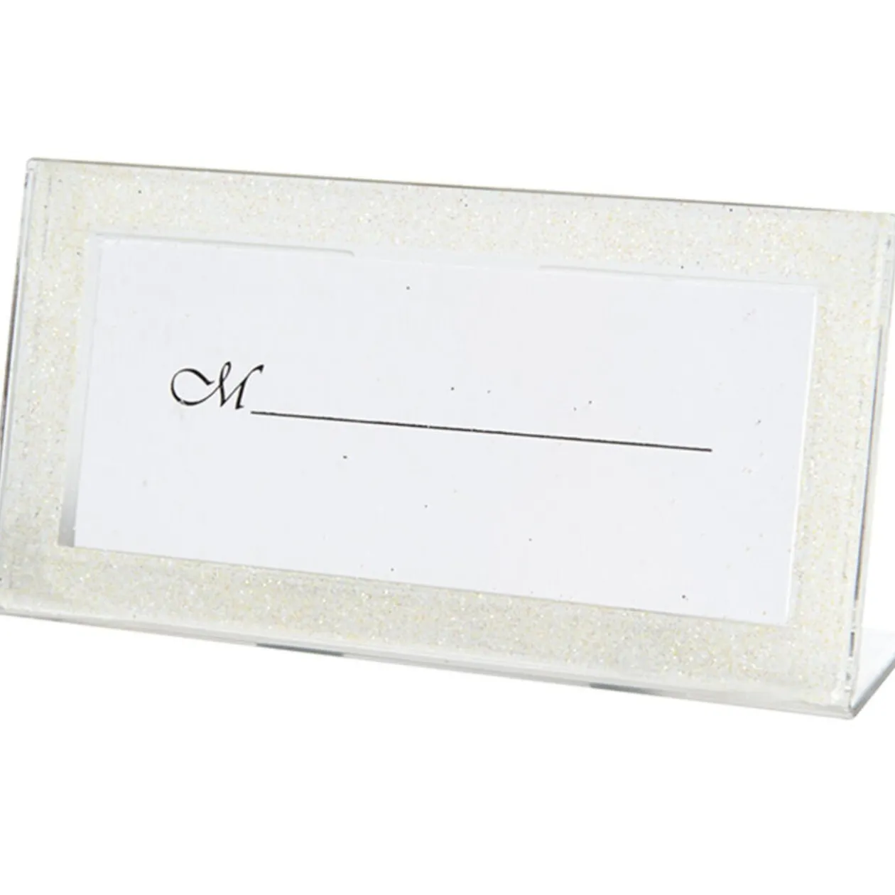 Porte nom design cadre ivoire pailleté, dim. 11,5xh.5,8 cm, plastique et acrylique. Peut s’utiliser en décoration de table de mariage.