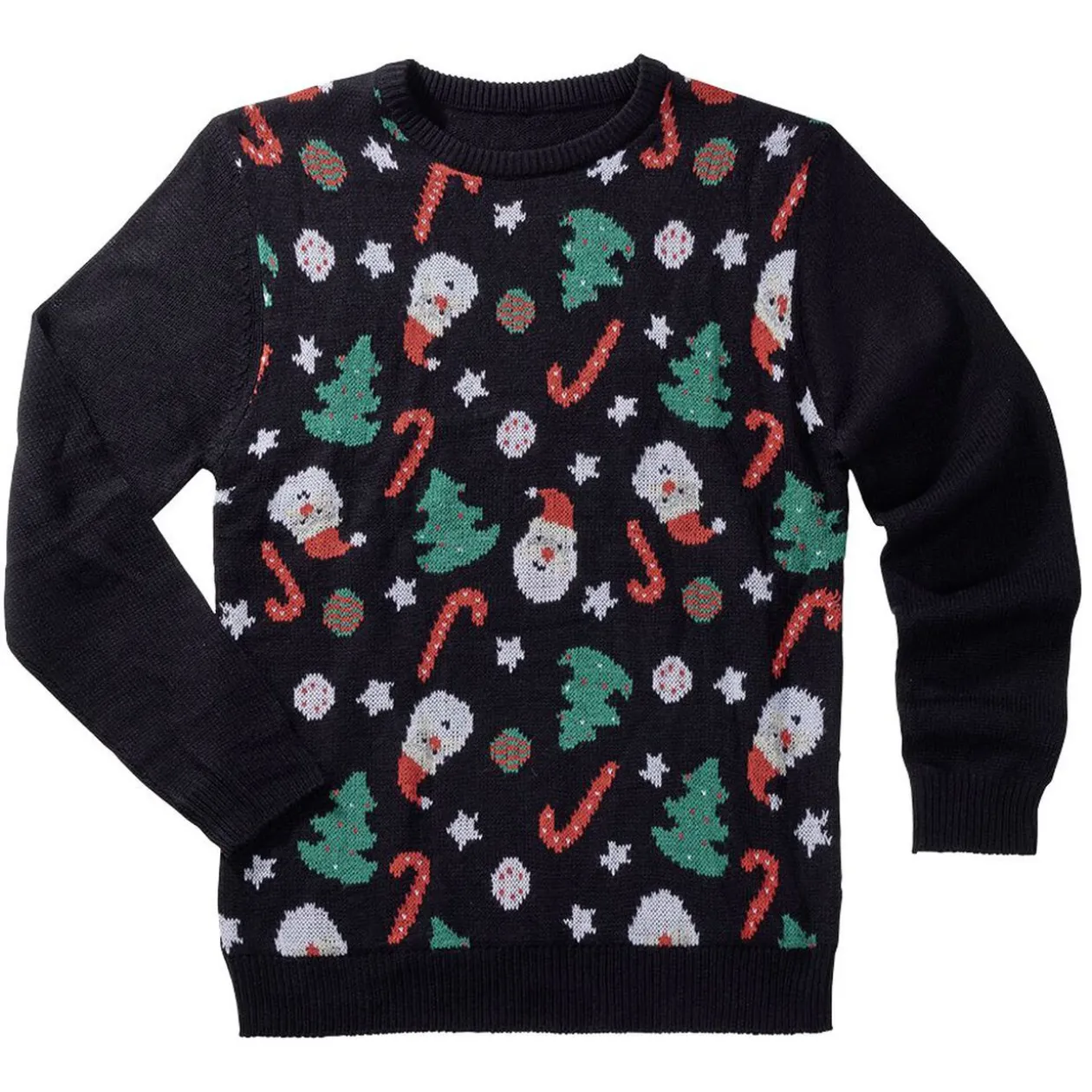 – pull uni noir motifs Père Noël, sapin, sucre d’orge, étoiles