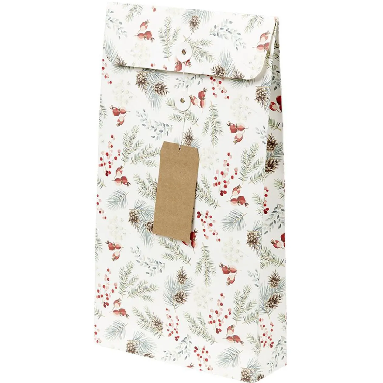 Sac cadeau de Noël sur le thème nature hivernale, idéal pour offrir une touche fleurie à vos cadeaux.