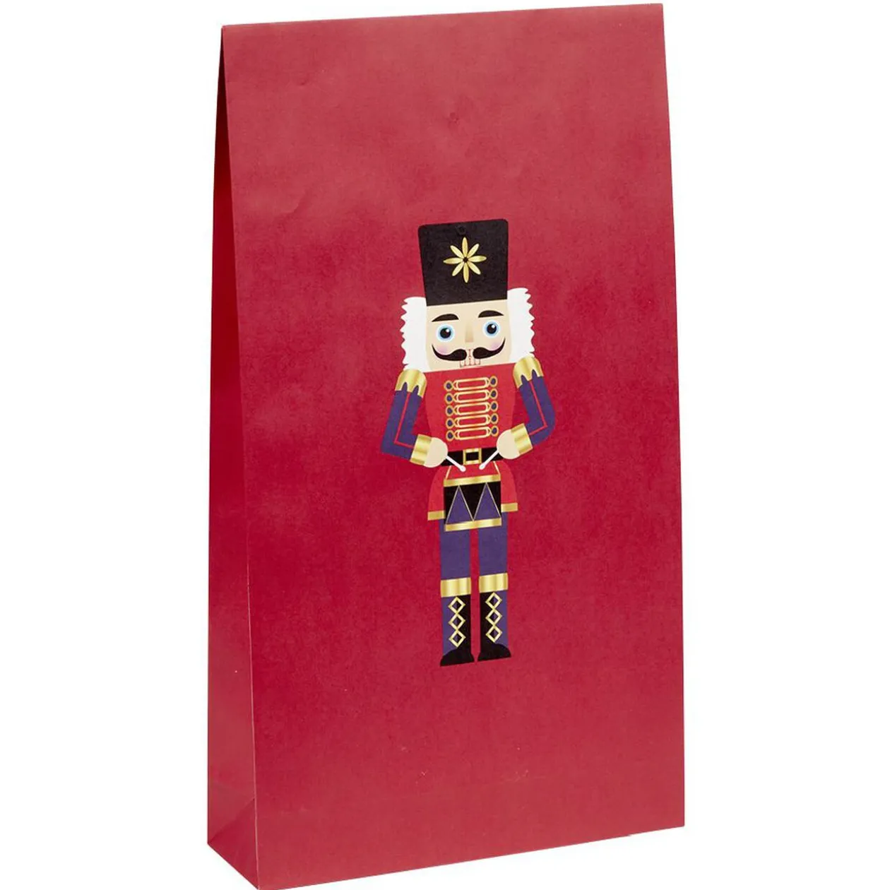Sac cadeau de Noël avec un style vintage et traditionnel, de couleur rouge avec Casse-Noisette ou vert et bleu avec tête de renne blanche.