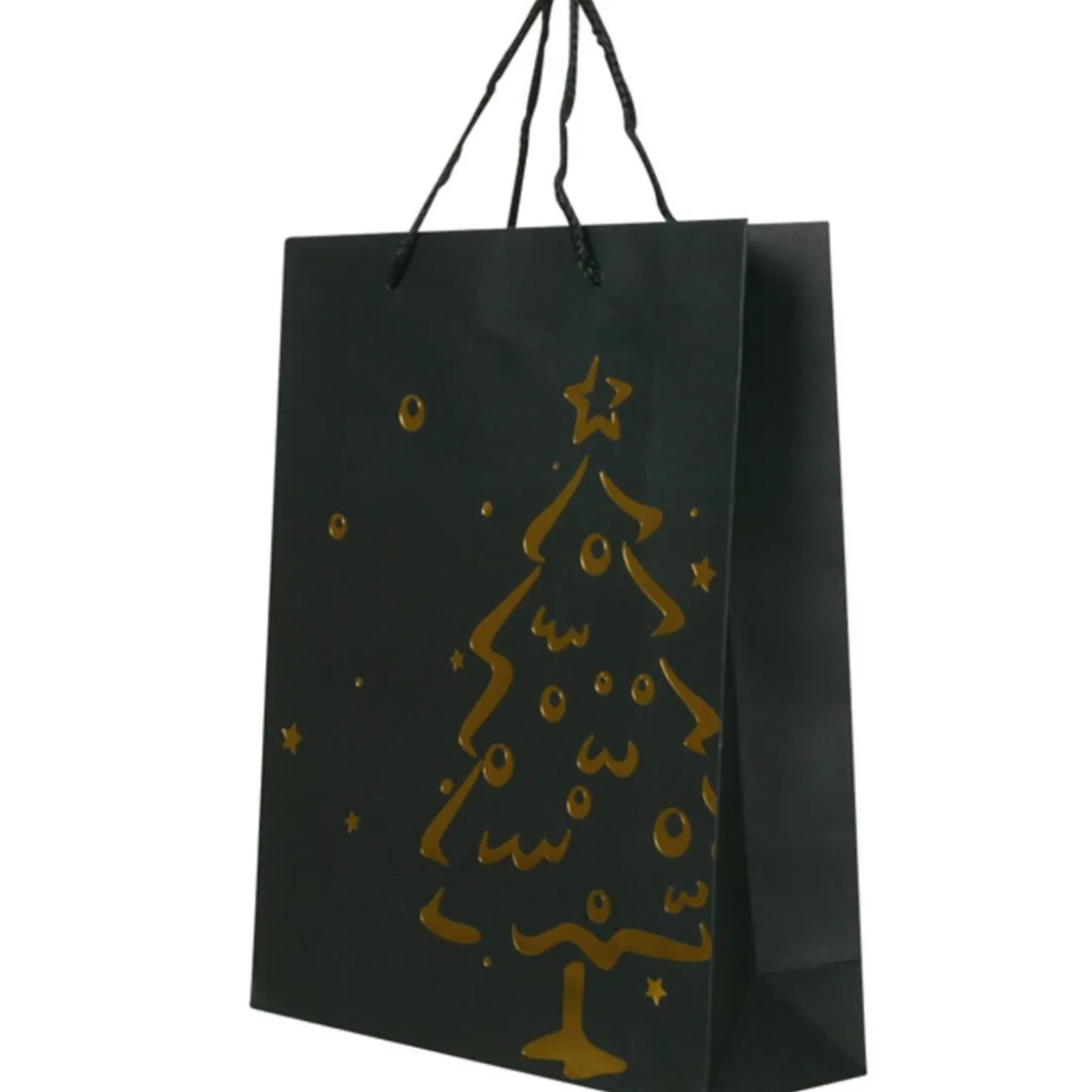 Sac cadeau de Noël noir à motif brillants, différents design doré, turquoise, rose brillant, disponibilité selon arrivage, dim. 26x9xh.32 cm, papier.