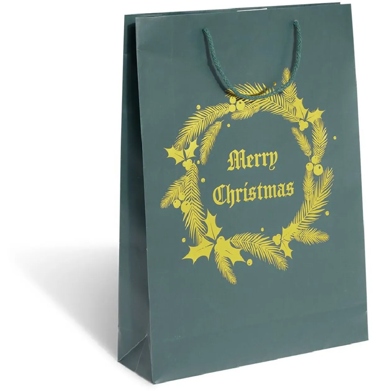 Disposez au pied de votre sapin, ce sac cadeau rouge à motifs floraux avec renne façon vintage ou vert avec imprimé doré « Merry Christmas », à remplir d’une ou plusieurs étrennes à l’occasion de Noël.