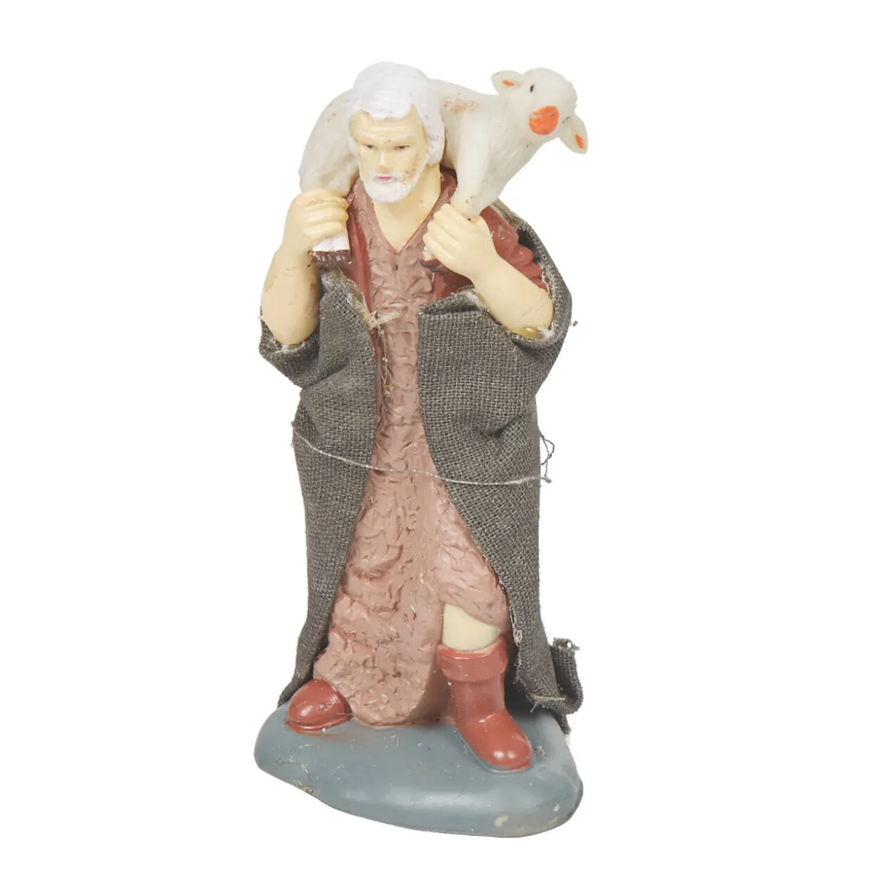 Santon pour crèche de Noël représentant le berger du village portant un agneau sur les épaules.