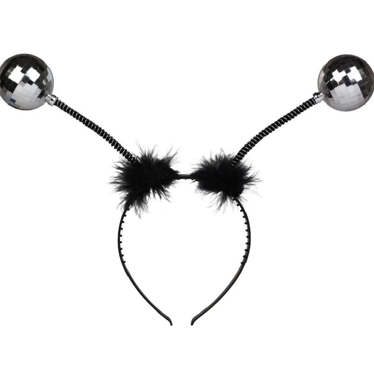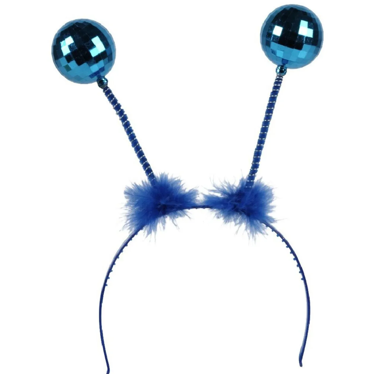 Serre-tête avec plumes fantaisie et antenne boules à facette.