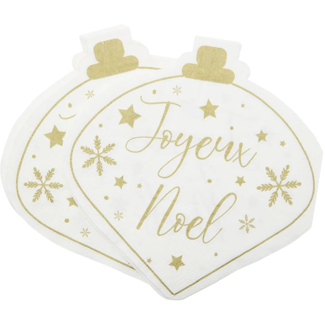 Lot de 10 serviettes en papier blanc et doré en forme de boules de Noël, idéal pour créer une table de réveillon festive et élégante.