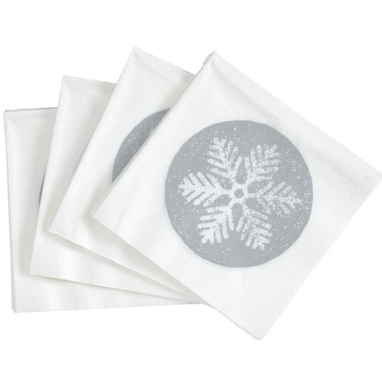 Lot de 20 serviettes jetables en papier blanc imprimé flocon gris argenté.