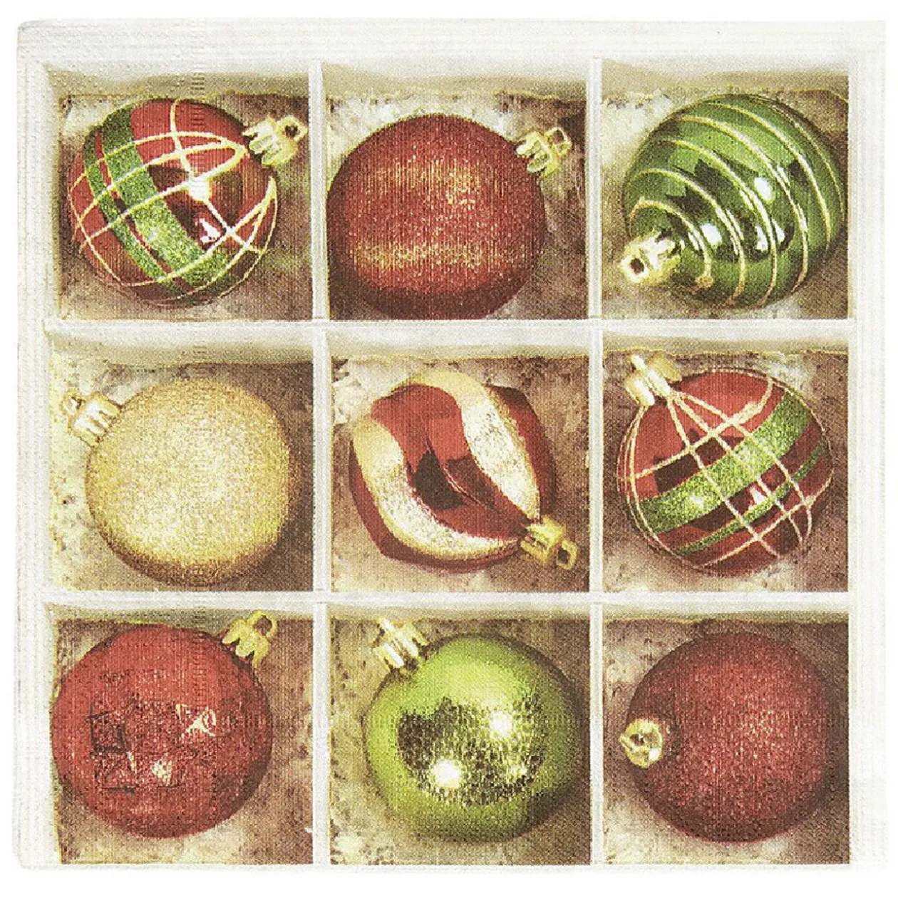 Lot de 50 serviettes en papier imprimé Boule de Noël rouge, vert et doré.