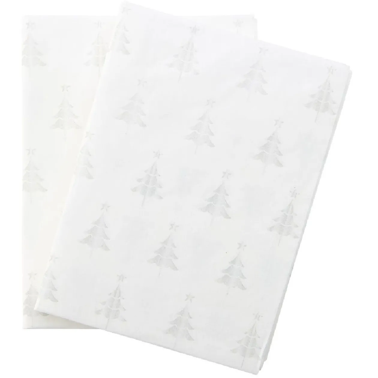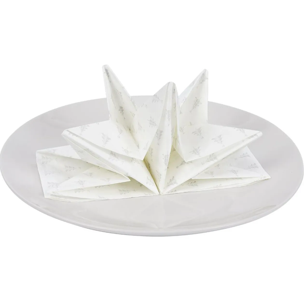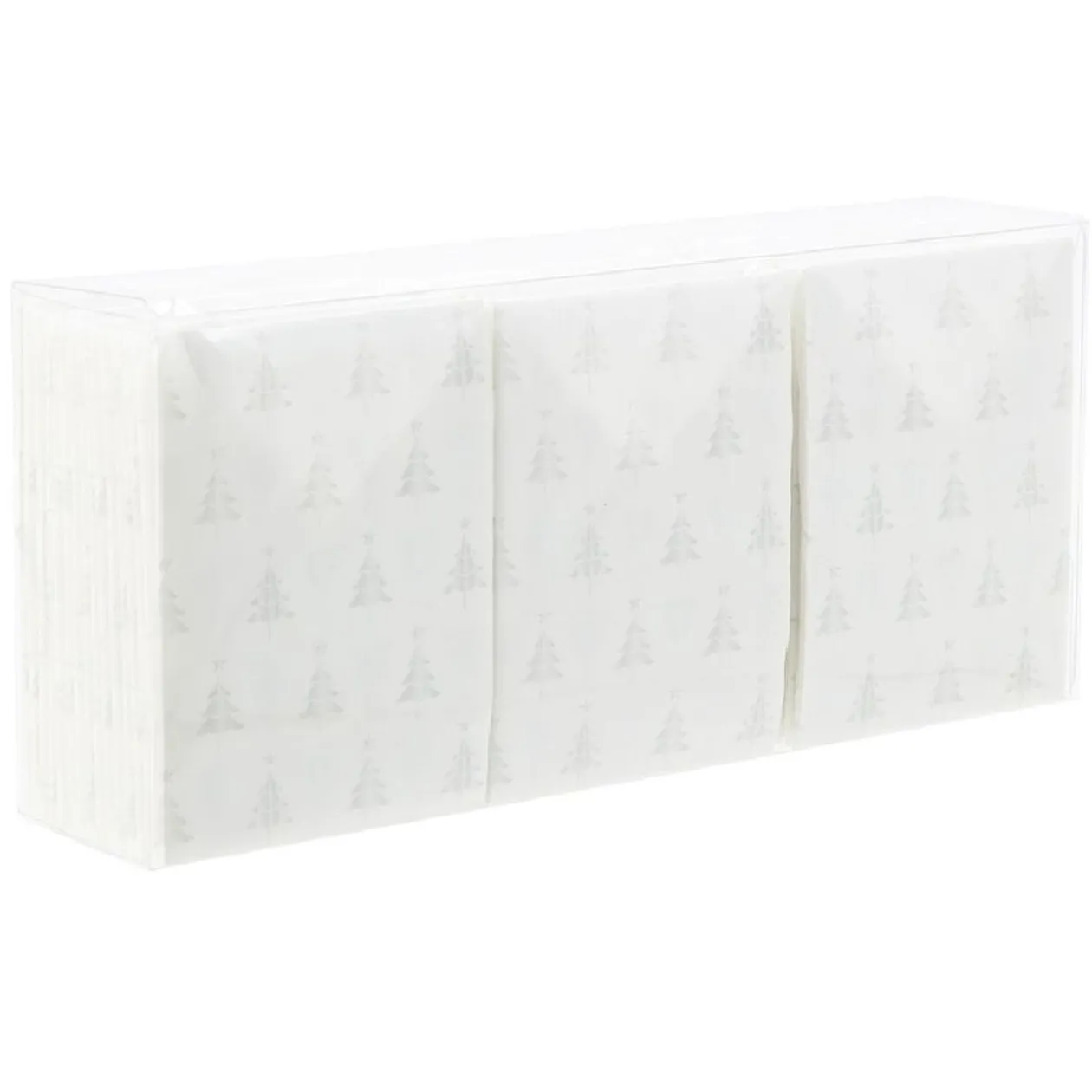 Lot de 12 serviettes en papier blanc avec motifs sapins de Noël gris argentés pour une table de réveillon festive et élégante.
