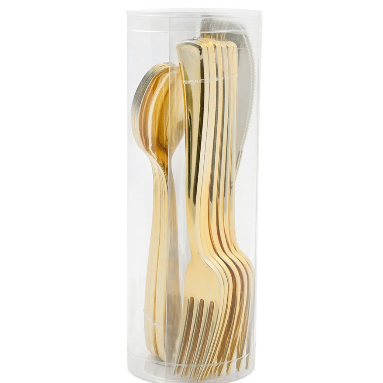 Set de couverts jetables pour 6 personnes en plastique de couleur dorée comprenant :
